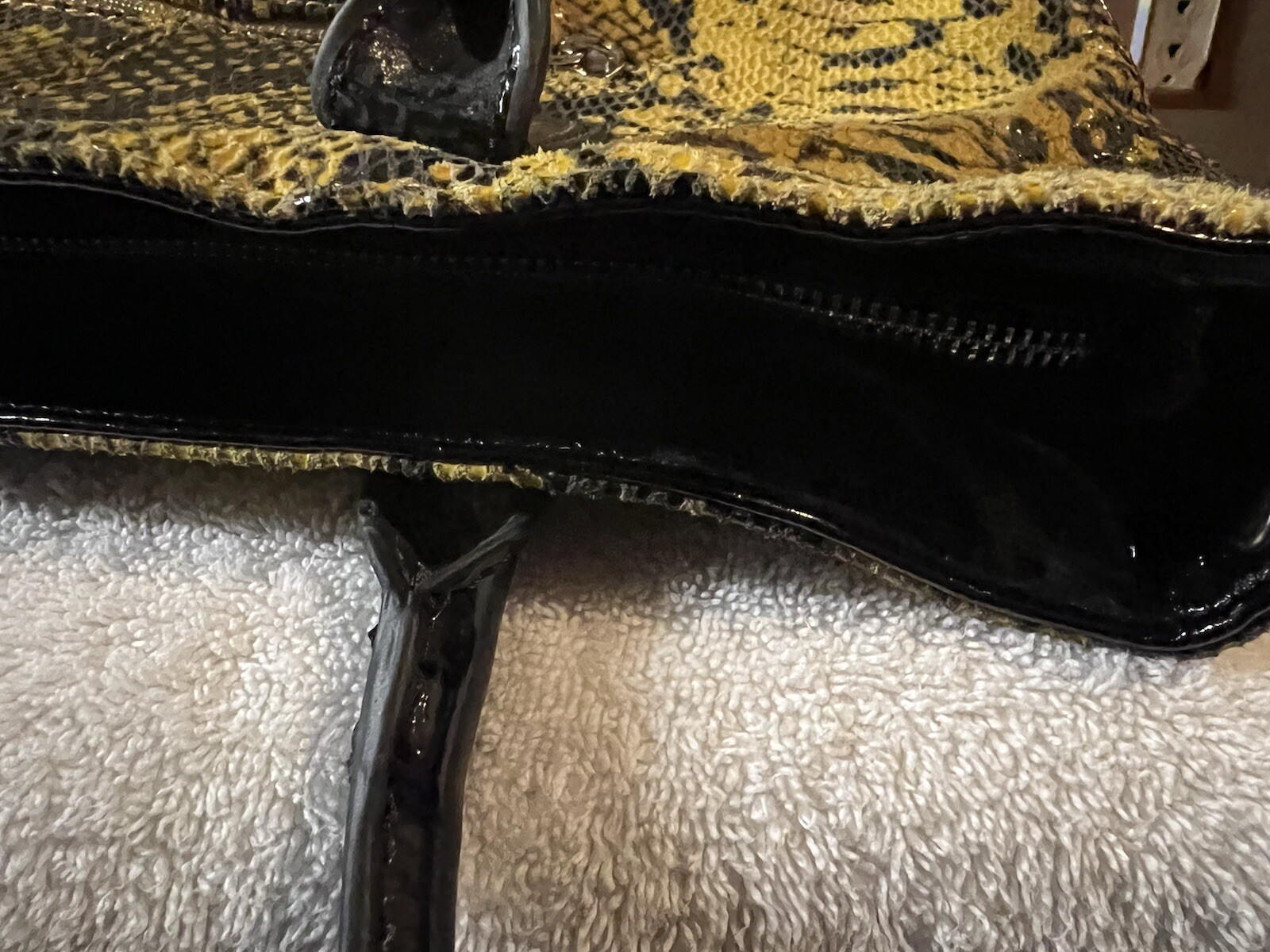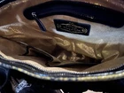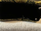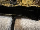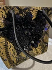 This Mary Norton tote purse features a unique design with a black snake skin pattern and 3D flower accents, giving it a stylish and eye-catching look. The bag is a large rectangle shape with a zip closure, scalloped and studded accents, and a gold or silver hardware color option. It has a black shoulder strap, faux leather exterior material, and a gold lining color, making it a fashionable choice for travel or casual occasions. The tote is finished with a coated exterior for added beauty and style.