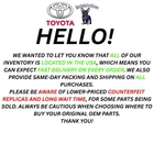 Message Us BRAND NEW TOYOTA GENUINE ORDERS ARE SHIPPED SAME DAY IF PLACED BEFORE 5 PM EST If Express or Expedited shipping is not available, please contact us. GENUINE TOYOTA PART # 77390-33011 Valve Assembly, Fuel Tank Overfill Check Key Features: Quality and Fit OEM Standards 100% Genuine Part Ready to Order? Don't miss out on this high-quality, genuine part. Order now and enjoy fast shipping! If you are not sure this will fit your vehicle, please message us your VIN before ordering to verify compatibility. FOR: Year Make Model Body & Trim Engine & Transmission 2004 Toyota Avalon XL, XLS 3.0L V6 - Gas 2003 Toyota Avalon XL, XLS 3.0L V6 - Gas 2003 Toyota Camry LE, SE, XLE 2.4L L4 - Gas, 3.0L V6 - Gas 2003 Toyota Solara SE, SLE 2.4L L4 - Gas, 3.0L V6 - Gas 2002 Toyota Avalon XL, XLS 3.0L V6 - Gas 2002 Toyota Camry LE, SE, XLE 2.4L L4 - Gas, 3.0L V6 - Gas 2002 Toyota Solara SE, SLE 2.4L L4 - Gas, 3.0L V6 - Gas 2001 Toyota Avalon XL, XLS 3.0L V6 - Gas 2001 Toyota Solara SE, SLE 2.2L L4 - Gas, 3.0L V6 - Gas 2000 Toyota Avalon XL, XLS 3.0L V6 - Gas 2000 Toyota Solara SE, SLE 2.2L L4 - Gas, 3.0L V6 - Gas 1999 Toyota Solara SE, SLE 2.2L L4 - Gas, 3.0L V6 - Gas