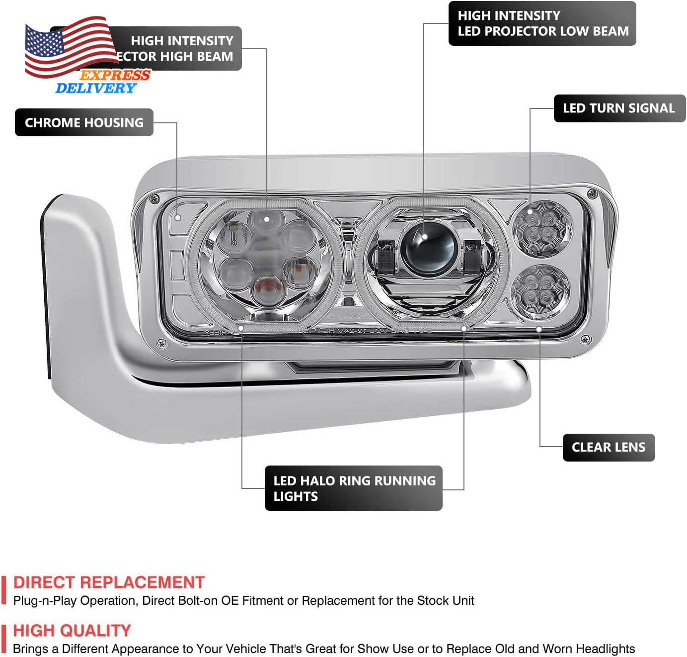 Store New Arrivals Add to Favorite View Feedback Contact Full LED U-Type Projector Headlights Compatible with 81-88 Peterbilt BUY IT NOW Description Item model number HL-HAY-058-CH Package Dimensions 23 x 22.5 x 13.35 inches Lens Material Polycarbonate Light Source Type LED Voltage 12 Volts Assembly Required No Year 1988 Color Chrome Model HL-HAY-058-CH Style Peterbilt 058 359/379/389 Manufacturer Part Number HL-HAY-058-CH Item Weight 35.7 pounds Lens Color Clear Exterior Clear Lens Auto Part Position Front Automotive Fit Type Vehicle Specific Fit Special Features Waterproof Vehicle Service Type Truck Special Feature Waterproof Specific Uses For Product Head Lights 【FITMENT】 Compatible with 1981-1988 Peterbilt 359 / 1987-2007 379 / 2008-2021 389 【FEATURES】White LED Halo Ring Running Lights ; Amber LED Turn Signal Light; Full White LED Projector High & Low Beams; Integrated Inline Resistor on Turn Signal to Prevent Hyperflashing 【PACKAGE INCLUDES】 Comes with a Complete Set of Headlights (Driver and Passenger Side); Great for Show use or to Replace Old and Worn Headlights 【QUALITY CONSTRUCTION】 Made of High-Quality ABS Plastic / Polycarbonate Lens / Steel for Exceptional Impact Resistance and Long-Lasting Durability 【Easy to Install Headlights】Tool Kit & Gloves for Easy Installation; Built in Mount; Requires Wiring to Vehicles Existing Wiring Harness A headlight (headlamp) is a lamp attached to the front of a vehicle to light the road ahead. Headlight performance has steadily improved throughout the automobile age, spurred by the great disparity between daytime and nighttime traffic fatalities. Headlights are one of the most important components of your vehicle; they allow you to see the road in front of you clearly during the night and in any bad weather that may arise. Our headlights upgrade the face of your vehicle with clear style and extreme range. ABOUT US We offer the best prices around on high quality products. Our E-store includes media such as books, movies, music and games while offering electronics, toys, sporting apparel, clothing, tools, general home, garden items and more. SHIPPING We are always working hard to ensure your package arrives as soon as possible. Please understand that some factors like weather, high postal traffic, and the performance of shipping companies are outside of our control. We offer free shipping to the lower 48 states and ship within 2 business days of payment, usually sooner. We do not accept P.O. Boxes. Please provide a physical address. For shipping outside of the continental USA, we only use eBay's Global Shipping Program.The item is shipped to KY and then sent to the rest of the world. International customers are responsible for all duties and taxes. Continue to check out in order to calculate costs for shipping the item to your country. Messages regarding eBay's Global Shipping Program MUST be directed at eBay EXCLUSIVELY. RETURNS We offer a 30-Day Return Policy on items which you are not completely satisfied with. You have the option for a full-refund or an exchange of the item. No returns are available on items shipped outside of the USA. PAYMENT We accept PayPal. CONTACT US This page content is yet to come Please ad us to your favorite seller and visit again later Thank You CUSTOMER SATISFACTION We try our very best to make sure every customer is completely satisfied. If there's a problem, message us! We're happy to help. WE ACCEPT Copyright © 2021 AutoDS. | All Rights Reserved