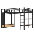 Full Size Loft Bed Frame w/Wardrobe,Metal Loft Bed with Storage Shelves Black Features 【Efficient Storage Combination】This bed comes with closet, shelves and Pegboards with smooth drawer slides, easy to open and close, perfect for storing clothes or other sundries and keeping the room tidy. Sturdy hanging rods are installed above the drawers, which are convenient for hanging clothes, bags or bath towels, solving the temporary storage pains and avoiding the accumulation of clothes. 【Side multi-function Pegboard】One side of the bed is equipped with Pegboard, users can freely match the hooks, shelves, baskets and other accessories, personalized storage of small objects or temporary favorite collection. 【Safety Guaranteed】 Full-length guardrails on the upper bed prevent accidental falls. The staircase tightly attaches to the bed for easy access and wobble-free footing. 【Space Saving】Through precision-engineered 3D design, it seamlessly integrates shelving, drawers, multi-tiered storage, and flexible expansion zones within the bed structure. This simultaneously addresses sleep, study, storage, and display needs – delivering true all-in-one functionality! 【Easy to Assemble】All parts included in your package are indicated clearly. With step-by-step installation manual and pre-drilled holes, you can easily assemble this bed individually. Descriptions Description: This Metal Loft Bed has an Open Wardrobe with its own hanging rod and two bottom drawers for storage. The other side has two shelves for added storage and display area, and the upper shelf can also be used as a desk for study or work needs. The sides are equipped with Pegboard to provide flexible hanging and display space, which can be expanded freely with accessories. The upper bed is designed with a full-encompassing raised guardrail to protect the user's sleeping safety and reduce the risk of falling. This three-dimensional integrated design brings together the functions of sleeping, studying, storage and display, greatly improving the utilization of space. Description & Dimensions Product Type Metal Loft Bed Size Full Color Black Material MDF +Metal verall Product Dimension 88.6"L x57.5 "W x65 "H Overall Product Weight 151.46LBS Detail Product Dimension Please refer to the Size image Number of Package 2 Package Dimension Please refer to the Specification Weight Capacity 350LBS commended Mattress Thickness 6'' Assembly Required Yes Country of Origin China Notes Manual measurement has been used, there may be some reasonable error.