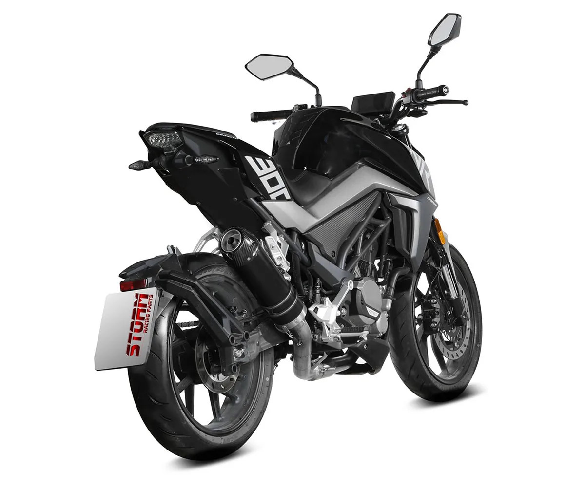 Full System Exhaust Storm by Mivv Muffler GP Black Steel with Carbon End Cap for CF Moto NK 300 2021 > 2024 Product code 74.CF.007.LXSBC Compatibility: Brand: CF MOTO Model: NK 300 Cc: 300 Years: 2021 > 2024 Configuration: [ GP ] - FULL SYSTEM EXHAUST - (High Passage) Dressing: Black Stainless steel with carbon end cap NOTE: EURO 5 APPROVED ONLY WHEN ACC.077.A1 CATALYST IS INSTALLED Homologation NOISE db(A): ECE approved if optionally catalysed (Euro5) Exhaust gas CO2: ECE approved if optionally catalysed (Euro5) All pictures shown are for illustration purpose only. Actual product may vary due to specific product application. Storm is a brand owned by Mivv Company , an Italian company specializing in development and sale of OEM and aftermarket exhaust systems for motorcycles , entirely made in Italy. Created in 2006, the Storm brand aims to combine quality , which for half a century has distinguished the Mivv production, to products with a unique sound . Storm exhausts are developed with the same techniques used in Mivv products, sharing the high technological level, the result of continuous R&D work and the experience acquired by the company in competitions , thanks to the cooperation with teams involved in national and world championships. Ref: 455671_74.CF.007.LXSBC