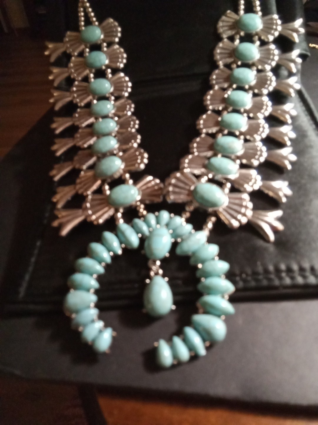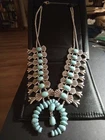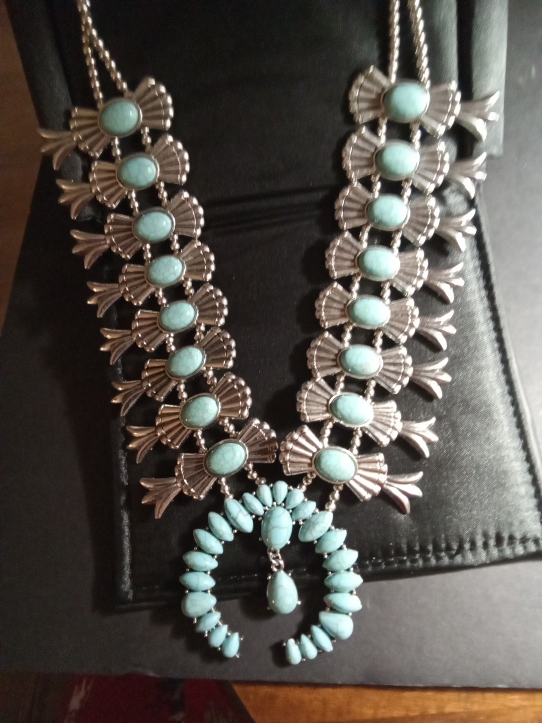 This vintage faux squash blossom necklace is a fun and eye-catching piece of costume jewelry. With a pendant style and adjustable features, this necklace is perfect for adding a touch of whimsy to any outfit. The undated era and lack of antique or signed pieces make it a versatile accessory suitable for various occasions such as anniversaries. Made without any secondary stones or handmade customization, this necklace offers a unique and stylish addition to any jewelry collection.