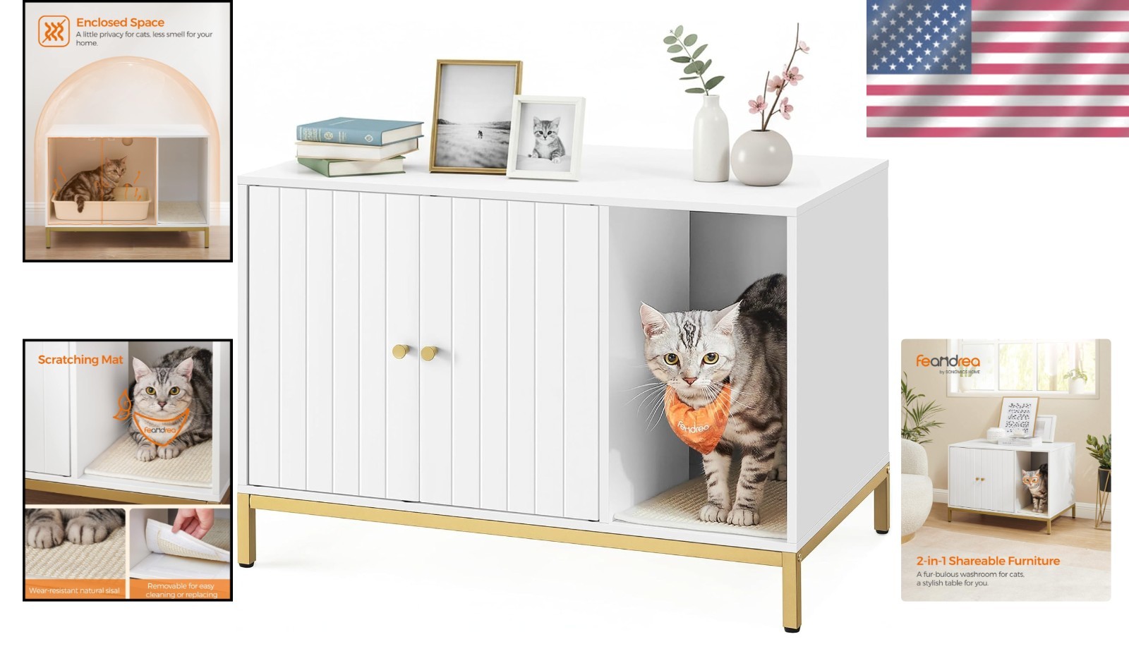 Functional Cat Furniture: White & Gold Litter Box Enclosure with Cabinet Doors ‹ › ‹ › ‹ › ‹ › ‹ › ‹ › ‹ › ‹ › ‹ › ‹ › ‹ › Functional Cat Furniture: White & Gold Litter Box Enclosure Style the Litter Box Area Transform your cat's bathroom into a chic corner with this exquisite litter box enclosure. Featuring a pristine white finish paired with a luxurious gold-colored metal frame, this modern piece effortlessly blends with your existing furniture, turning a previously messy area into a stylish sanctuary. Satisfies Cats' Natural Instincts Designed with your feline friend's comfort in mind, the hidden litter box offers an enclosed space that provides the privacy and security cats crave. The winding entryway caters to their natural curiosity, while the integrated scratching mat not only accommodates their scratching instinct but also traps stray litter, keeping your home tidy. Fits Most Litter Boxes, Most Spaces Measuring 20.5" x 19.7" x 16.5", this versatile enclosure is perfectly sized to accommodate most litter boxes. The thoughtfully designed front entry allows for flexible placement in any room without concern for directional orientation. For Cats, Also for You This multifunctional piece serves as more than just a litter box cabinet. Turn it into a cozy cat house by adding a comfortable cat bed inside, or repurpose it as a stylish side table or TV stand, ensuring both you and your cat enjoy this luxurious furniture piece together. Easy Assembly, Easy Cleaning Your convenience is paramount. With clear, step-by-step instructions and labeled components, assembly takes just 30 minutes. The elevated design not only facilitates easy cleaning beneath the enclosure but also features two doors for straightforward scooping, making maintenance a breeze. Why Choose Our Litter Box Enclosure? Say goodbye to unsightly litter boxes cluttering your living space. This elegant litter box enclosure not only conceals the mess but also enhances your home décor. Treat your furry friend to a stylish and private bathroom that you'll both love! Shipping Free & Fast Shipping - We offer free shipping to most of the USA with a normal delivery time of 3-7 days. However, due to the current situation, additional delivery time (up to 3 weeks) may be required for some items. Alternative Carriers - We may use alternative carriers (e.g. USPS, FedEx, UPS, etc.) to ensure your package arrives safely and on time. Due to the use of multiple carriers, we are unable to provide a tracking number automatically. Handling Time - Orders are processed and shipped within 1-2 business days of receiving cleared payment. Shipping Restrictions - Shipping to Alaska, Hawaii, Puerto Rico, Guam, and other US territories may incur shipping charges or delivery restrictions. Please contact us before ordering, or your order can be refunded/cancelled. State Restrictions - There may be restrictions based on your state of purchase. For example, certain items may not be shipped to California due to state regulations. Contact for Tracking Updates - If you require tracking updates or have any concerns about the delivery of your order, please feel free to contact us, and we will be happy to assist you. Return 30-Day Hassle-Free Returns - We want you to be completely satisfied with your purchase. If you are not, you can return the item within 30 days of receiving it for a full refund or exchange. Easy Return Process - To start a return, simply contact us and we will provide you with a prepaid return shipping label and detailed instructions. Restocking Fee - There are no restocking fees for returns. However, the buyer is responsible for return shipping costs if the return is not due to a seller's error. Refund Processing Time - Refunds will be processed within 5 business days of receiving the returned item in its condition. Payment We accept all major credit cards, PayPal, and Apple Pay for your convenience. Your payment information is secure and encrypted to ensure a safe and seamless transaction. Please complete your payment within 3 days of purchase to avoid any delays in shipping. Feedback Your feedback is extremely important to us. We strive to provide the best products and customer service possible. If you are satisfied with your purchase, please take a moment to leave us a positive review. If you have any concerns or issues with your order, please contact us before leaving negative feedback. We are committed to resolving any problems and ensuring your satisfaction. Contact Us If you have any questions or concerns, please feel free to out to our customer support team. You can contact us through the eBay messaging system. We are available Monday to Friday, 9:00 am to 5:00 pm EST, and we will do our best to respond to your inquiry within 24 hours. Buy it now and enjoy a pleasant shopping experience! Model: Cat Litter Box Enclosure MPN: Cat_Litter_Box_Enclosure Unit Quantity: 35.9 pounds Type: Hooded Litter Box