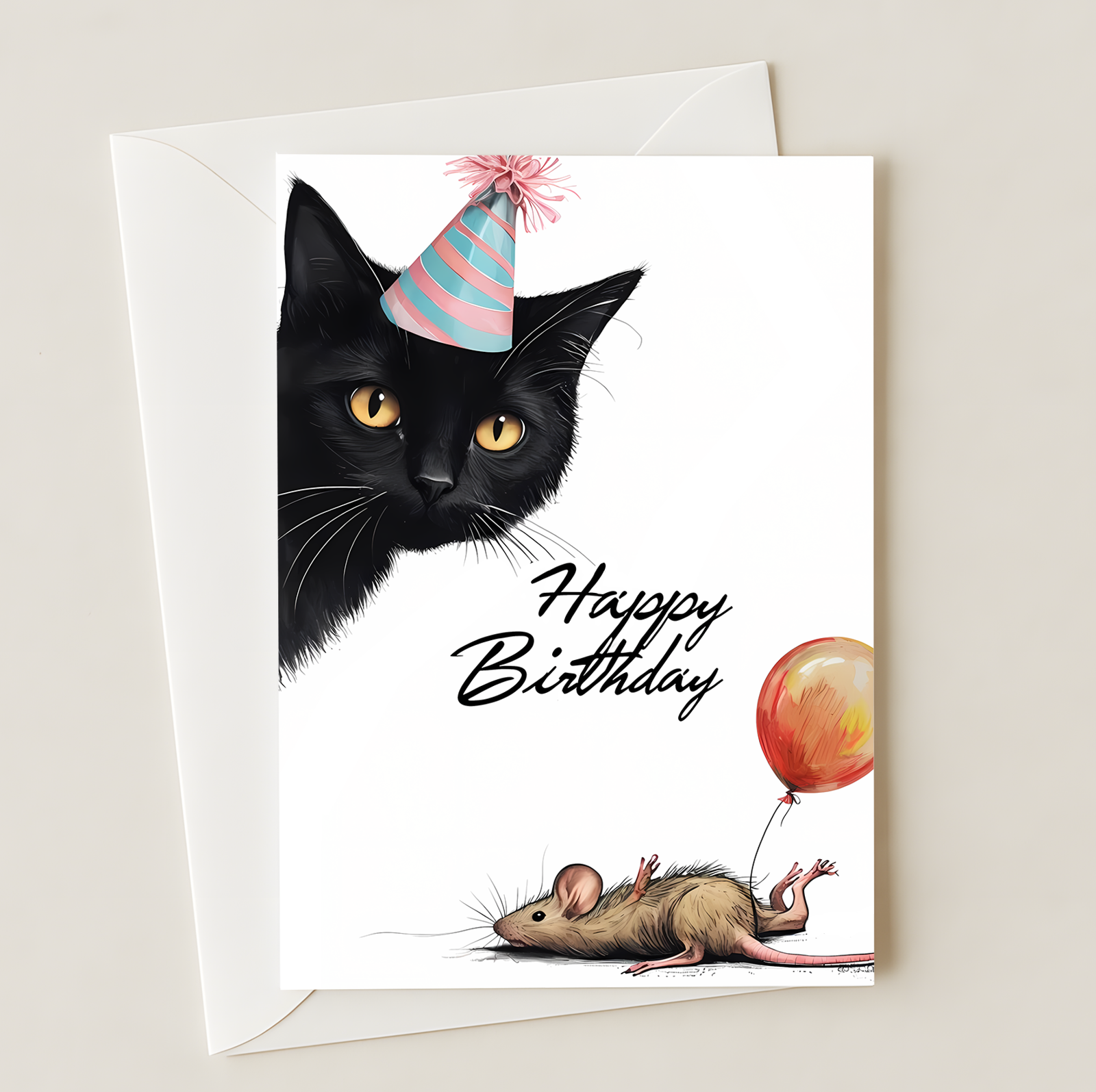 Make them smile with this funny cat-themed birthday card featuring a cheeky black cat in a party hat and a surprised mouse tied to a balloon. Front Text: “Happy Birthday” with cat & mouse illustration Design: Playful, light-hearted cartoon-style art – perfect for animal lovers Size: A5 (approx. 148 x 210 mm) Inside: Blank for your own personal message Envelope: Includes plain white envelope Condition: Brand new, unused Packaging: Sent in a protective sleeve and board-backed “Do Not Bend” envelope A great choice for friends, family, or colleagues who love cats and enjoy a bit of humour on their birthday.