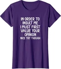 eBay Store Fast Shipping Hasslefree Returns Secure Payment Excellent Service Funny In Order To Insult Me Joke Sarcastic Tee Comedy All of our Ladies t-shirts are brand new and made to order. They are printed in our New York facilities with love and passion. We use various printing methods to ensure you the high quality, long lasting garments you or your loved ones deserve. We carry sizes from Small to 2XL in short sleeve women t-shirts (depending on the design). You can refer to "SPECS & SIZING" to get accurate information regarding the sizes of the garments we use. This design is also available and printed on different types of garments in our store.If you would like this graphic printed on a different type of garment than a short sleeve t-shirt, please make sure to check our store ! If you have any questions regarding this item or any other item we have for sale, do not hesitate to contact us. We answer all messages within 1 business day. Specs & Sizing Shirt Care Tips Payment Shipping Returns Feedback Wash inside out with cold water with similar colors using a gentle cycle. Tumble dry low or hang-dry Avoid using bleach and do not dry clean. We accept payment by any of the following methods: PayPal Please pay as soon as possible after winning an auction, as that will allow us to post your item to you sooner! Your order will be dispatched within 2 business days of receiving payment (Monday-Friday) with a tracking number. In the very unlikely event that your item is lost or damaged during post, then WE are responsible and will issue either a full refund or replacement. If you are not 100% satisfied with your purchase, you can return the product and get a full refund or exchange the product for another one, be it similar or not. You can return a product for up to 14 days from the date you purchased it. Any product you return must be in the same condition you received it and in the original packaging. Please keep the receipt. * Your great positive feedback will be greatly welcomed! * If you have any problem when you receive the item, please contact us first, we'll do our best to resolve the problem!:) If you have any questions or concerns please contact us. © 2024 All Rights Reserved