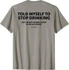 Told myself to stop drinking joke T-Shirt Designed and Printed in USA Product Features: • Classic Look and Feel: This ultra cotton tee offer the timeless appeal of traditional cotton. The high-quality print enhances its casual appearance. • Material: Made from 6.1-ounce, 100% cotton. (Note: Dark Heather variant is 50% cotton, 50% polyester.) • Durability: Features double-needle stitching on the neck, sleeves, and hem for added durability. Designed for a roomy, unisex fit. • Print Type: DTG (Direct to Garment) • Manufacturer: Gildan 5000, 5000b (Made in USA) Shipping Information: • Handling Time: With POD(Print-On-Demand) product model, we typically require about 3 business-days handling time before shipping. In most cases, our handling time’s , rang e from 1-2 business days. • Delivery Time: • USA: Approximately 2 -6 business days • Canada: Approximately 6-10 business days (We currently don’t offer international Shipping) • Worldwide: Approximately 15-25 business days (We Currently don’t offer international Shipping) • Shipping Carriers: USPS and DHL • Note: Business days exclude weekends and holidays. Return & Exchange Policy: • Quality Guarantee: We stand behind the quality of our products and workmanship . Any defects or errors on our part must result in a refund/ replacement at no charge. • Conditions for Returns: Returns are generally not accepted for user errors such as incorrect selection of sizes, designs, or colors. Returns /Replacements are acceptable for damages such as poor printing results, incorrect size or design caused by us. • Note: Please reach out to us if there are any questions or issue s with your item, we’ll do our best to resolve any issue you might have. Note: • We’re glad to have your support! If you have a moment, y our honest feedback is very valuable to us. Thank you!
