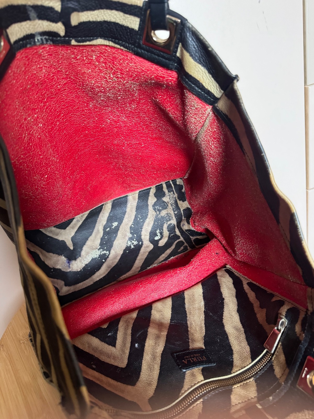 The Furla Animal Print Tote Bag in Multicolor is a stylish and spacious accessory for women. Made of leather with a leopard print exterior, this large tote bag features a magnetic closure and black leather handles. The gold hardware accents and pleated details add a touch of sophistication to this trendy yet practical handbag, perfect for everyday use. The black leather lining provides a sleek contrast to the bold exterior design, making it a versatile and eye-catching addition to any outfit.