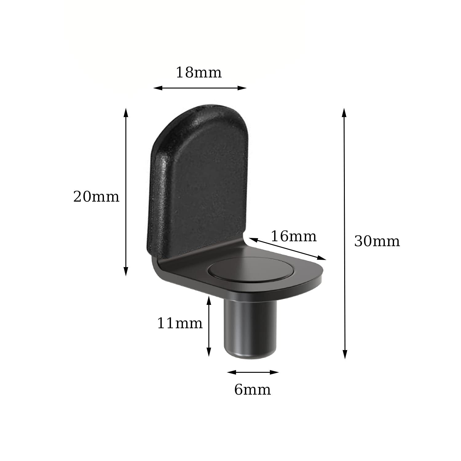 These shelf support pins Very easy to install by hand, can be widely used for cabinet, bookshelf, display cabinet, furniture, wardrobe, closet, cupboard, bookcase. Color: black. Size 6 mm in diameter, pin length is 11mm, and the shelf rest is 20 mm length, 16 mm width. You will get 30 Pcs shelf bracket pegs with rubber sleeve, Rubber sleeve protects glass shelves from getting scratched as it eliminates any rattling. Support pegs Using advanced insert molding process, the support are integrally formed, not easy to loose and wear and has a long. Easy to install by hand, you can use them for cabinet, bookshelf, display cabinet, furniture, wardrobe, closet, cupboard, bookcase, meet your daily needs.