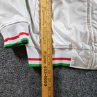 The Futbol Italia Track Jacket is a stylish vintage piece perfect for soccer enthusiasts. Made of 100% polyester with a striped design, this jacket features a full zip closure and long sleeves. Ideal for activewear, machine washable for easy care, and available in men's size small. The white and blue color scheme adds a classic touch, while the brand Italia adds a touch of authenticity. The stand-up collar and logo theme give the jacket a sporty and retro aesthetic, making it a must-have for any soccer lover.