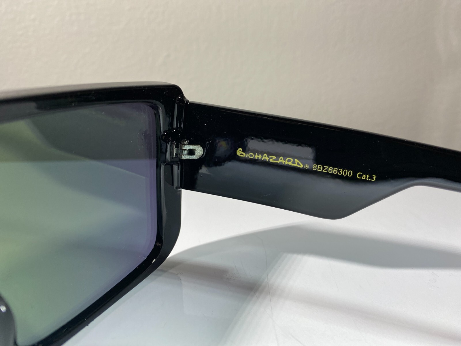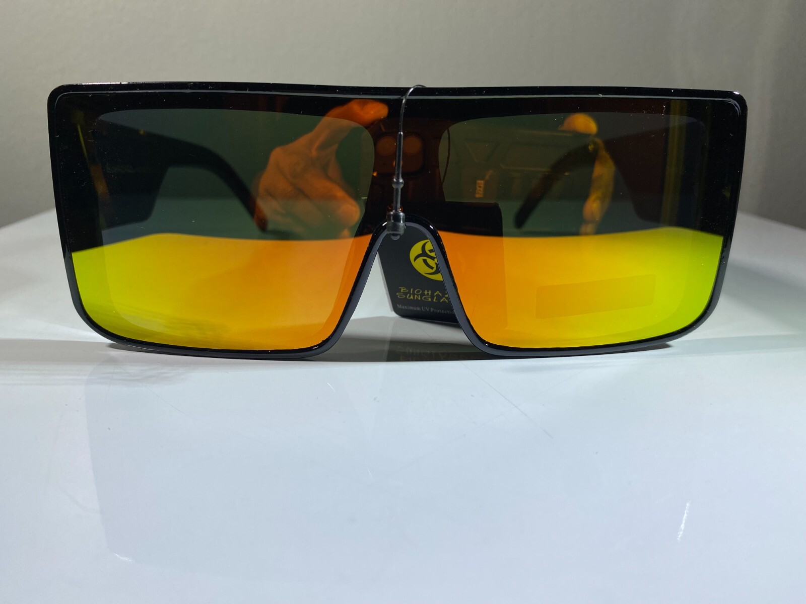 Unisex futuristic style sunglasses with black frame and yellow reflective lenses. Unique style at great price.
