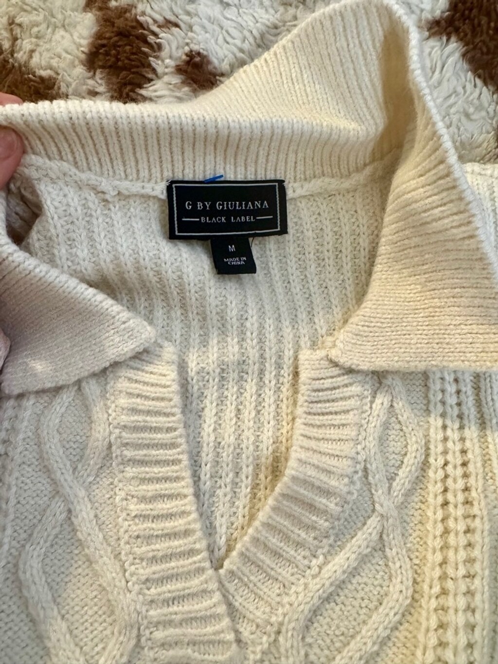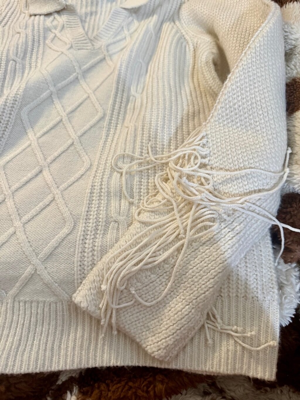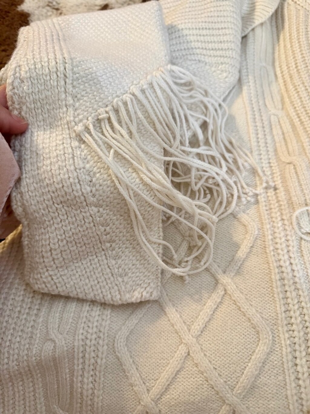 Keep cozy and stylish this season with G,by,Guiliana's Black Label Cream Heavy Weight Knit Tassel Sweater. Made with premium materials and expert craftsmanship, this medium-sized sweater is a must-have for fashion-forward individuals. Its unique heavy weight knit design provides warmth and comfort while the tassels add a touch of bohemian charm. Perfect for both casual and dressy occasions, you'll be turning heads wherever you go. - Premium materials - Expert craftsmanship - Versatile design - Warm and comfortable - Bohemian touch #WinterFashion #SweaterWeather #CozyChic #GbyGuiliana