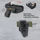 High Quality Military & Police Grade Polymer OWB Holster Specially Designed For Fast Draw During Duty Or Shooting Competition. Weapon Compatibility - Outside Waistband Tactical H olster Holster fit Glock 17 (Gen 1-5) 9mm Luger Glock 17L (Gen 1-5) 9mm Luger Glock 17C (Gen 1-5) 9mm Luger Glock 19 (Gen 1-5) 9mm Luger Glock 19X (Gen 1-5) 9mm Luger Glock 19T (Gen 1-5) 9mm Luger Glock 22 (Gen 1-4) .40 S&W (Not fit Gen 5) Glock 23 (Gen 1-4) .40 S&W (Not fit Gen 5) Glock 31 (Gen 1-5) .357 SIG Glock 32 (Gen 1-5) .357 SIG Glock 44 .22 LR Glock 45 9mm Luger ( Without laser and no embedded chassis, and no flashlight style ) Ease and Comfort Push side buttons to achieve the fast opening and closing, unique design allows for belt carrying or vest carrying, perfectly used by duty holsters, uniformed law enforcement officers, security personnel, military personnel, private persons, and shooting sports holsters. And it fits closer to the body which can achieve better concealment under clothes. High S afety Secure Level II I Retention - Auto-locking system restrain pistol in the holster to ensure ultimate safety, activate the release by pressing the button with the index finger to achieve gun access . A djustable Easily set Holster 60 degrees to your desire position with Allen key, compatible belt width up to 2 inch . Tough & Durable Material Custom-molded body made of polymer stronger than leather that will wear out, adapt to every bad environment In the Package: · 1*Holster with Paddle Attachment · 1*Allen Key Shipping: Ships same day or next except Sundays and Holidays ! Free shipping! Ship by USPS First Class Package. 100% MONEY BACK GUARANTEE. Any question please be free to contact with us .Thanks!