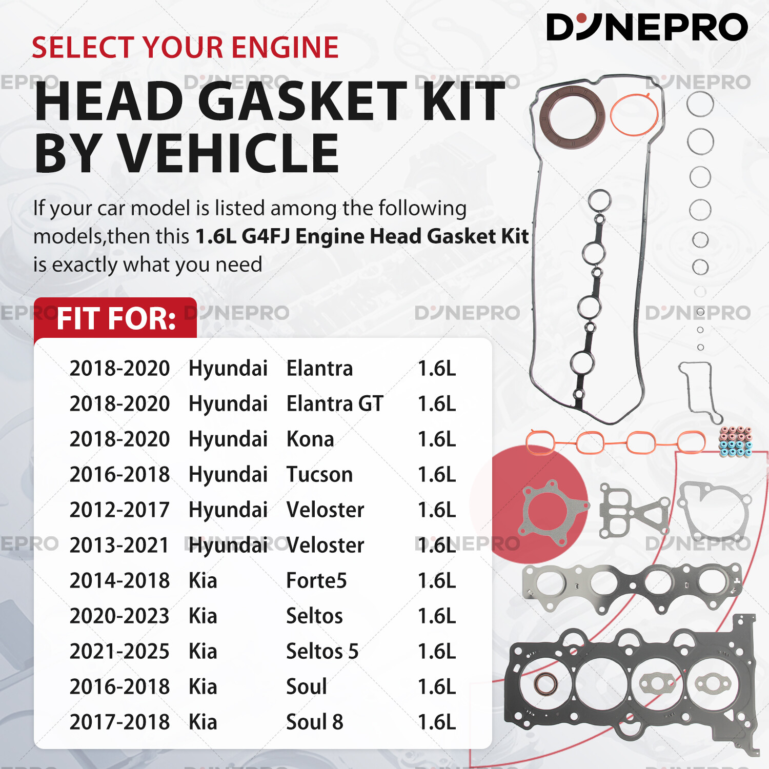 Engine Parts Installation Guide About Us Contact Us Feedback Dynepro® Pro Series Master Engine Rebuild Kit For Hyundai OEM Spec Certified Engine Repair Kit Precision Engineered · Factory Reliability ⭕ Cylinder Gasket Set Five-layer composite structure: 0.1mm stainless steel liner (resists high-pressure deformation) Aramid fiber sealing layer (withstands 350°C continuous thermal shock) Graphite coating (self-adapting micro-gap filling) Passed 100,000 thermal cycling tests for factory-grade sealing. ⭕ Built For Hyundai Owners: ✔️ Oil sludge cleanup (Theta II/Lambda engine rebuilds) ✔️ Timing chain rattle fixes (Nu/Gamma engines, includes tensioner tool) ✔️ Turbo failure prevention (1.6T/2.0T models, full gasket/seal refresh) ✔️ 200,000km+ overhauls (full bolt kit with factory torque specs) ⭕ For Hyundai TechTrust : ✔️ Restore factory power. Drive with Korean precision. ✔️Order Now – Free OEM Repair Manual Included! Support: Email us (Master Techs on call) ⭕ Why Genuine? ⚠️ Cheap parts fail: Non-genuine pistons crack under GDI’s 150-bar fuel pressure. Knockoff chains stretch, causing valve-piston interference. ✅ for Hyundai spec Certified : 100% material compliance with Hyundai MS-350 durability standards. Direct from OEM Plant spec suppliers. 5-year unlimited-mileage warranty. Vehicle Application Compatible with: G4FJ 1.6L engines. for Hyundai Accent 2012-2018 1.6L GAS Naturally Aspirated for Hyundai Elantra 2017-2020 1.6L GAS Turbocharged for Hyundai Elantra GT 2018-2020 1.6L GAS Turbocharged for Hyundai Kona 2018-2020 1.6L GAS Turbocharged for Hyundai Tucson 2016-2018 1.6L GAS Turbocharged for Hyundai Veloster 2012-2017 1.6L GAS Naturally Aspirated for Hyundai Veloster 2013-2021 1.6L GAS Turbocharged for Kia Forte5 2014-2018 1.6L GAS Turbocharged for Kia Rio 2013-2017 1.6L GAS Naturally Aspirated for Kia Seltos 2020-2023 1.6L GAS Naturally Aspirated for Kia Seltos 2021-2025 1.6L GAS Turbocharged for Kia Soul 2011-2018 1.6L GAS Naturally Aspirated for Kia Soul 2017-2018 1.6L GAS Turbocharged Note: VIN confirmation required. What's included in this complete bundle set -Full Gasket Set -10 Cylinder Head Bolts Shop Now >> Instant Fitment Email your Hyundai model (e.g., Elantra, Tucson, Santa Fe) and year → Get a repair kit tailored to your VIN. Restore factory power, drive like new. Tech Support: Email us (Provide VIN for tailored parts list) Learn More Learn More Learn More PAYMENT We accept eBay managed payments for all orders. If you have any questions, please contact us. SHIPPING Ordering this kit requires additional information: the vehicle engine model as well as the VIN (17 digits), and also requires you to verify a match to your vehicle using the vehicle application data on Ebay. Be sure to provide this information when placing your order or via a separate message. Product will be shipped within 1-3 business days after full payment is received and verified. Delivery Time is about 3-7 business days to most of countries. We ship the package to your shipping address in eBay instead of the one in PayPal. Please tell us your shipping address if it is different from the one in eBay. RETURNS We offer eBay's best return policy. If you utilized Ebay's fitment and the parts you received do not fit your vehicle, we will pay to have them returned. Should you desire to return this kit for any other reason, Includes kits that are incorrect because you did not provide the VIN in the order notes, you will be responsible for return shipping. These kits are heavier and cost more to ship, so we ask that you provide vehicle information and verify suitability before ordering.Unfortunately, we cannot accept returns from international customers at this time. ★★★★★ So far the engine overhaul kit has performed well. I love the performance with this kit installed. On my 2004 F150. Installation was easy. Everything is perfect. Considering this kit is cheap, it doesn't get any better than this. ----James ★★★★★ This was a great price. lt was made in the USA. After 10,000 miles it is running great. ----Liam ★★★★★ As of the time of this review this is well worth the money and it fits as it should. ----Noah ★★★★★ This set was installed perfect fit. lt has been installed on a truck that has been used very much every day. Working perfect and so much cheaper than the auto stores. ----Ethan ★★★★★ Seemed to be a perfect replacement part and it works. ----Oliver ★★★★★ Everything fit how it was supposed to and have been driving it for a week with no problems. ----Benjamin ★★★★★ The seller was very nice and provided me with professional advice on the installation, which was a breeze and is still going strong after 10,000 miles. ----Michael