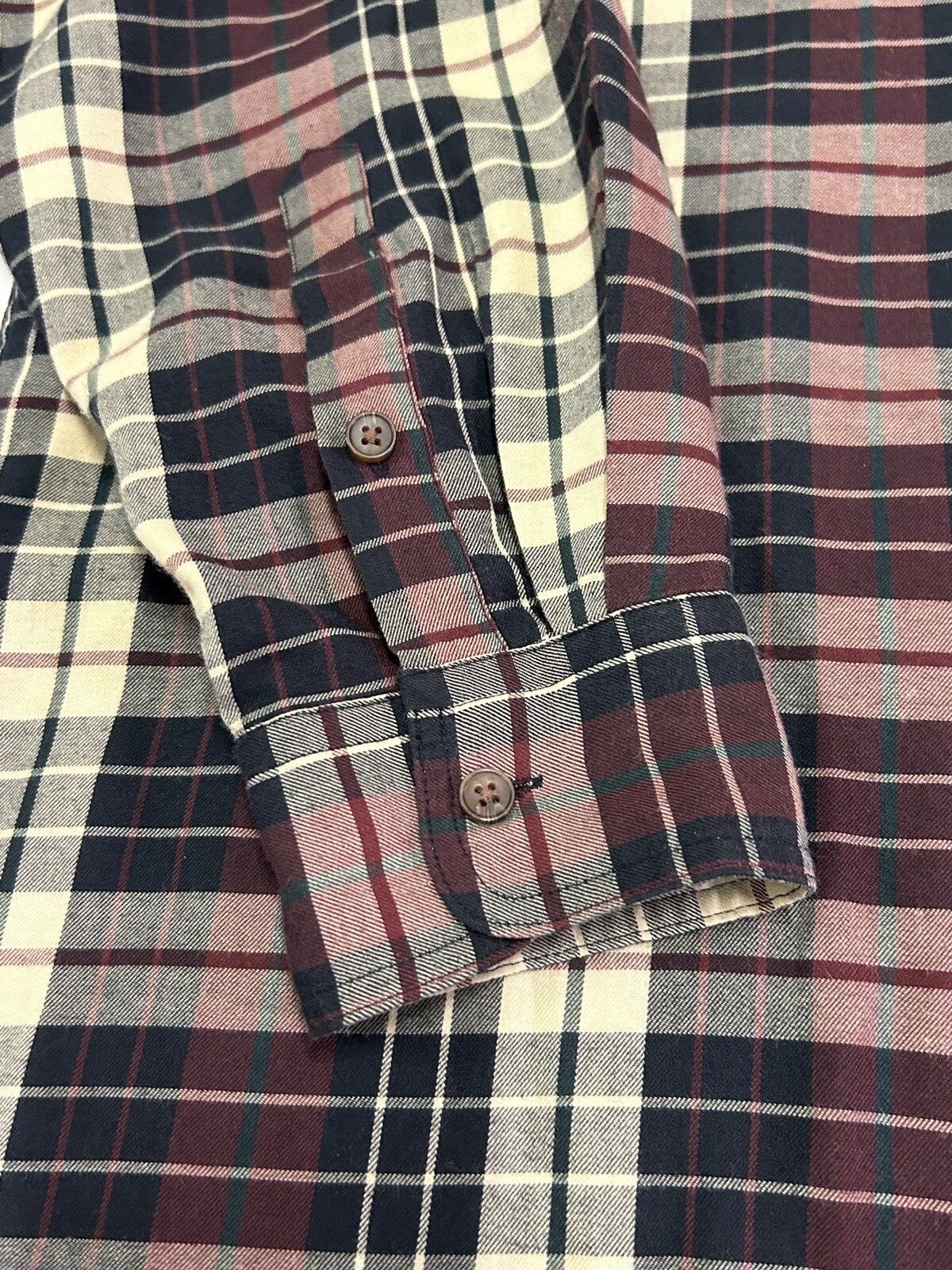 GANT Shirt Mens Large Heritage Twill Burgundy Black Cream Plaid Long Sleeve Button Up. Preowned in Excellent Condition. 30 inches shoulder to hem 25 inches pit to pit 23 inches sleeve Photos are part of description. We make an effort to supply plenty of photos to assist in your buying decision. Clothing: Please check appropriate measurements before purchasing. Preowned clothing may or may not have been worn, laundered or dry cleaned. Known details and observations are provided, as well as pictures. Seller welcomes communication and questions from potential Buyers. We operate under The Golden Rule....Do Unto Others, so please contact us through eBay if we can answer a question, provide more info, resolve an issue or improve your experience. It is our desire and plan to provide 5 Star service to every customer with fast shipping and accurate descriptions. We appreciate positive feedback. If there is a mistake, please allow us an opportunity to correct it before opening a ticket with eBay or leaving negative feedback. RETURNS: We offer a generous 30 Day return policy for items not as described or non-working unless otherwise described in listing so you can shop with confidence. We package carefully, so if an item is damaged during delivery, buyer will need to file a claim with carrier. Authorized returns must be returned with all the same packaging and box. Seller paid shipping for authorized domestic returns if not as described. Customer to pay return shipping for any authorized returns from international customers, Hawaii, Alaska, Guam, or anywhere outside of domestic U.S. SHIPPING: Shipping supplies have increased in cost. We try to obtain the lowest cost on supplies to keep shipping as reasonable as possible. There are many factors that affect shipping costs. When possible we try to upgrade shipping to Priority when able to use their supplies, facilitate faster shipping and insure package, especially for fragile items. We are happy to combine shipping with items purchased & paid the same day. Orders are always shipped out within one business day unless we are on a published time away. Many times shipping will occur same day. Note: Due to scammers, purchases made from Buyers with new accounts and/or no feedback may be cancelled and not shipped. We do not communicate outside of the eBay platform. International & Non Domestic Buyers: shipping will be handled through the eBay Global Shipping Program. Import duties, taxes, and charges are not included in the item price or shipping cost. These charges are the buyer's responsibility. Please check with your country's custom's office to determine what these additional costs will be prior to bidding or buying. We do not ship to P.O. Boxes. The Stanley Co will make every effort to make you a happy customer! Thanks for shopping with The Stanley Co! SEE ALL OUR EBAY LISTINGS HERE: TheStanleyCo.com