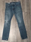 Elevate your fashion game with these stylish GAP skinny jeans in size 31 x 30. The dark wash blue denim fabric is perfect for any occasion and the distressed and ripped accents give it a trendy edge. The zip closure and button accents add a touch of sophistication to your outfit. Crafted from a comfortable cotton blend, these jeans feature pockets to store your essentials. The GAP 1969 model is designed to fit slim and is perfect for a preppy look. These jeans are a must-have addition to your wardrobe and are sure to turn heads.