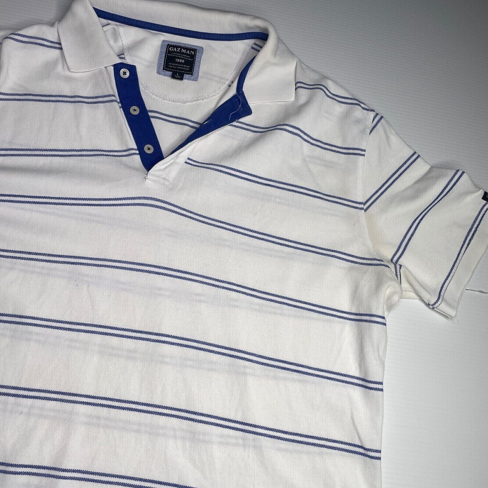 Welcome to our Ebay Store~! Item: GAZMAN Striped Logo Collared Polo Shirt Mens Size L White Blue Casual Style Fit Condition: Pre-Owned Very Good Condition Measurements LAYING FLAT: Armpit to Armpit:61 cm Shoulder to Shoulder: 52 cm Length: 81 cm == Shipping: Shipped Fast and Tracked with Australia Post Standard Parcel 2-3 Day Handling Time Maximum