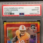 This rare and highly sought-after sports trading card features Chris Godwin of the Tampa Bay Buccaneers in a limited edition, exclusive collectors' edition. The card is perfectly graded at a PSA 10, ensuring its authenticity and quality. It boasts a stunning orange prizm color match, hologram, and serial number, making it a true gem for any collector or fan. The card is part of the 2023 Donruss Optic Football set and is certified with the number 100073277. With its short print, parallel/variety, and collectors edition, it's a must-have for any avid collector or fan looking to complete their collection. Don't miss out on this opportunity to own a piece of NFL history.