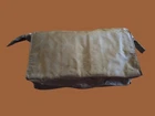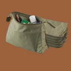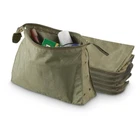 This German Army Bundeswehr personal toiletry kit bag is made of water-resistant nylon OD Green material and features a zipper top closure. vented on sides with five grommets. The bag has two large compartments on the sides (Inside) and three small ones in the center, as shown in the pictures. It measures 9.5" x 2.75" x 6.25" inches and is ideal for outdoor activities or travel.