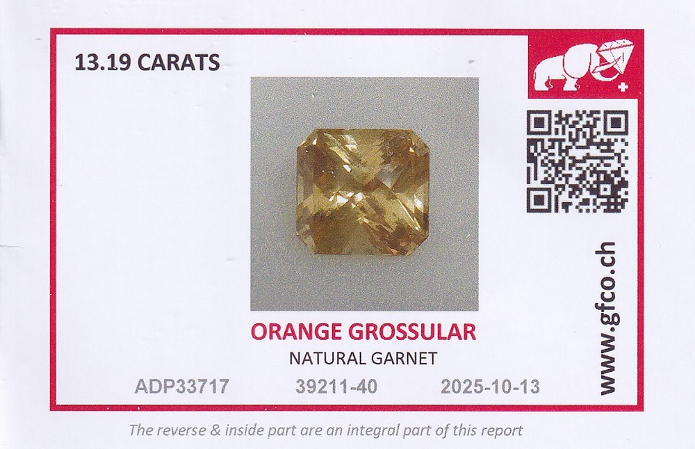 This exquisite 1 piece(s) of Natural Grossular Garnet originates from Sri-Lanka, weighing a total of 13.19 carats. It displays a fine Imperial Yellowish Orange, Octagon shape , measuring approximately 13.59 x 12.33 x 9.50 mm. The stone is Unheated Untreated. We truly appreciate your interest and look forward to providing you with exceptional service. Item Number: SL-KUNG997GNG-043-040 Quantity: 1 Pc(s) Weight: 13.19 Carat Gem Type: Natural Grossular Garnet Shape: Octagon Size: 13.59 x 12.33 x 9.50 mm. Color: Imperial Yellowish Orange Clarity: SI1 Luster: Stunning Origin: Sri-Lanka Treatment: Unheated Untreated Hardness: 7.0 - 7.5 on Mohs' scale Certificate: GFCO Gem Lab Gemstone Identification Report From Our Hearts to Yours Natural Beauty, Expertly Selected Gems. Listen to our storeโs music and enjoy shopping! eBay Store Your browser does not support the video tag. WE CAN PROVIDE CERTIFICATION FOR THIS GEMSTONE FROM 4 REPUTABLE LABS Test Gem weight: 0.01 - 3.99 ct/pc GIA Full Report $180 (30 days) GIA Full Report + Origin $220 Test Gem weight: 0.01 - 100 ct/pc Full Report $150 (30 days) Full Report + Origin $200 Test Gem weight: 0.01 - 100 ct/pc Brief Report $18.00 (14 days) Full Report + Origin $80.00 GFCO GEM LABยฎ Test Gem weight: 0.01 - 100 ct/pc Card Report $20.00 (14 days) Full Report + Origin $50.00 Top Seller Awards Guaranteed Satisfaction Powered by SixBit's eCommerce Solution