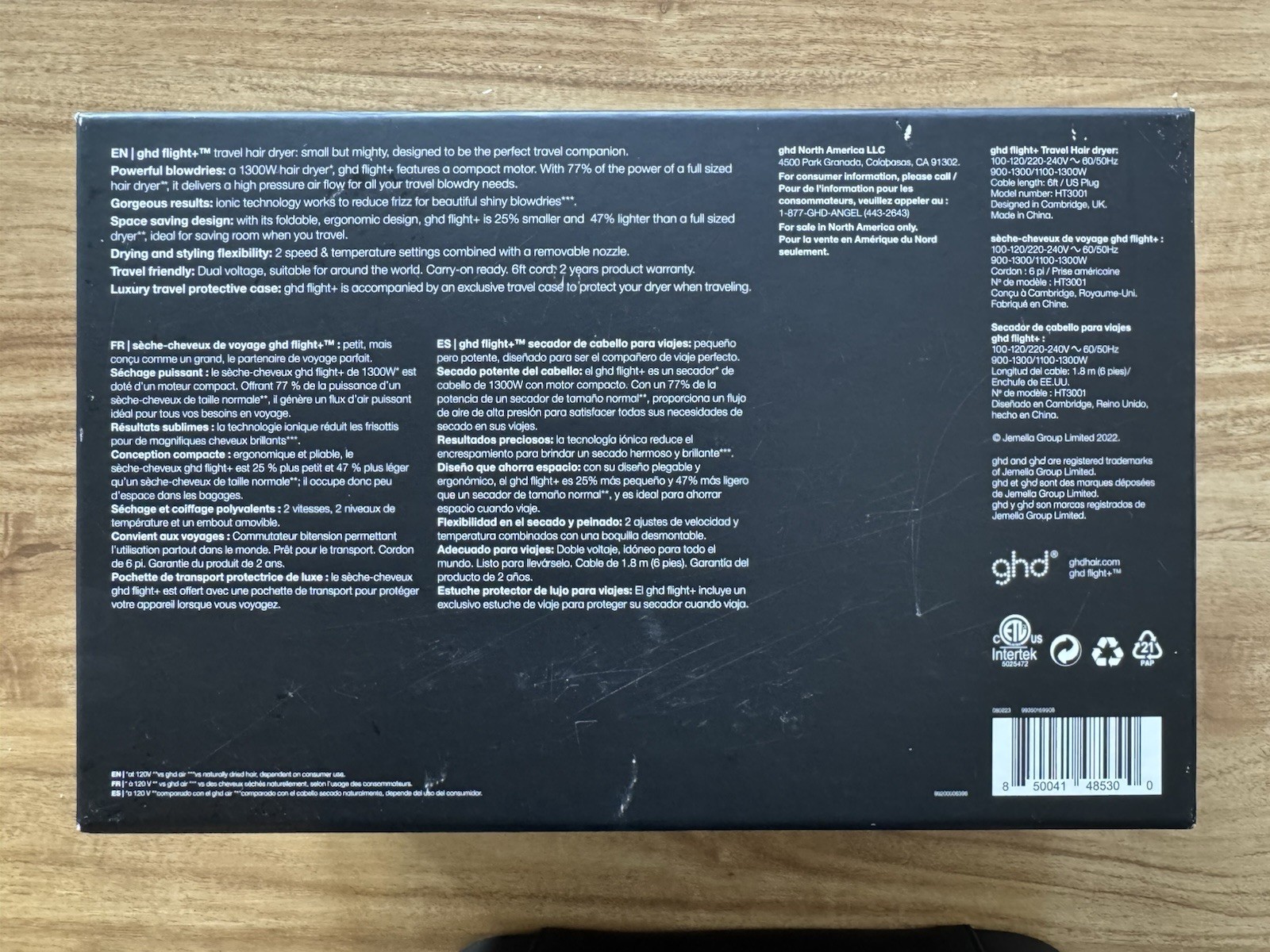 ghd Flight+ Travel Hair Dryer ― Dual Voltage 1300w Professional Portable Hair Volumizer, Suitcase Friendly, Lightweight, Powerful, and Compact Blow Dryer with Luxurious Travel Case ― Black. Never used. You’ll receive the item exactly as shown in the photos.