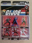This product is a set of GI Joe Nano Metalfigs action figures manufactured by Jada Toys in 2020. The set includes characters such as Cobra Commander, Snake Eyes, Storm Shadow, Baroness, Destro, and Duke. These figures are made of die-cast material and are designed in a 1:25 scale. They come with clothes and are part of the original G.I. Joe series. The figures represent the Military & Adventure theme and are licensed reproductions of the original action figures.