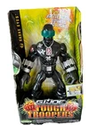 The product is a vintage 2008 GI Joe action figure of Snake Eyes from the G.I. Joe franchise. This specific action figure is part of the Tough Troopers series and features lights and sound effects. It is an original licensed reproduction and is still factory sealed, making it a collector's item for fans of GI Joe and military & adventure-themed toys. The figure is black in color and represents the iconic character of Snake Eyes from the GI Joe series, known for his skilled combat abilities and mysterious persona.
