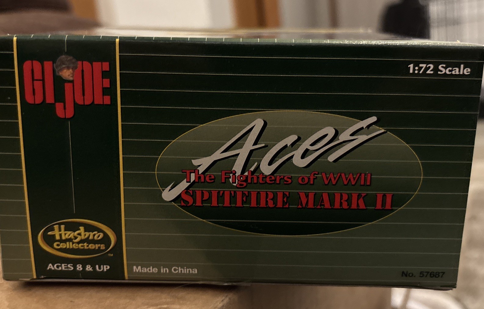 The GI Joe Spitfire Mark II airplane is a 1:72 scale diecast model of a military airplane from the 1930s. This green-colored model, part of the GI Joe character family, represents the Spitfire Mark II aircraft family used during World War II. Manufactured by Hasbro in 2000, this detailed replica is perfect for collectors or enthusiasts of military aircraft. The Spitfire Mark II model comes in its original packaging, making it a valuable addition to any diecast vehicle collection.