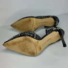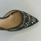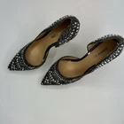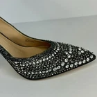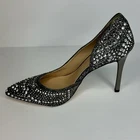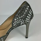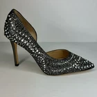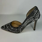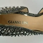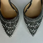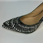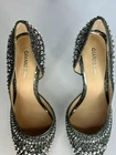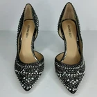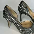 These heels are Gianni Bini Mairah Jeweled d'Orsay Stiletto Pumps. The shoes are black with an all-over rhinestone design and a pointed toe. The Gianni Bini Mairah Jeweled d'Orsay Stiletto Pumps are a formal, high-heeled shoe from the Gianni Bini Bridal Collection. These pumps are designed with a novelty glitter synthetic upper and feature jewel details. They have a single-sole stiletto construction, a pointed toe, and a slip-on closure. The heel height is approximately 3.74 inches.