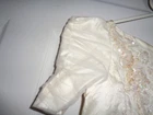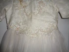 VINTAGE GIRL'S ALFRED ANGELO UNION MADE IN USA SIZE 5 WEDDING/COMMUNION BROCADE DRESS, BROCADE 85% ACETATE, LINING & TULLE 100% POLYESTER, 28 INCHES LENGTH WAISTLINE 22 INCHES, WHITE SATIN, LACE, TULLE, PRE-OWNED