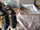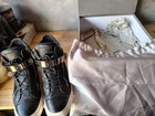 GIUSEPPE ZANOTTI Textured Leather Hardware High-Top Sneakers (Size 42). A textured black leather dominates the upper of the shoe offset with silver metal strap that goes across the forefront of the shoe. Like usual, zippers are used for detailing along with matching black waxed cotton laces. Round toe. Lace-up front. Dual-side zips. Logo detail at tongue and heel. Pull tab at back stay. Leather lining and insole. Rubber outsole. Made in Italy. Size Available: 42 Guaranteed 100% Authentic!