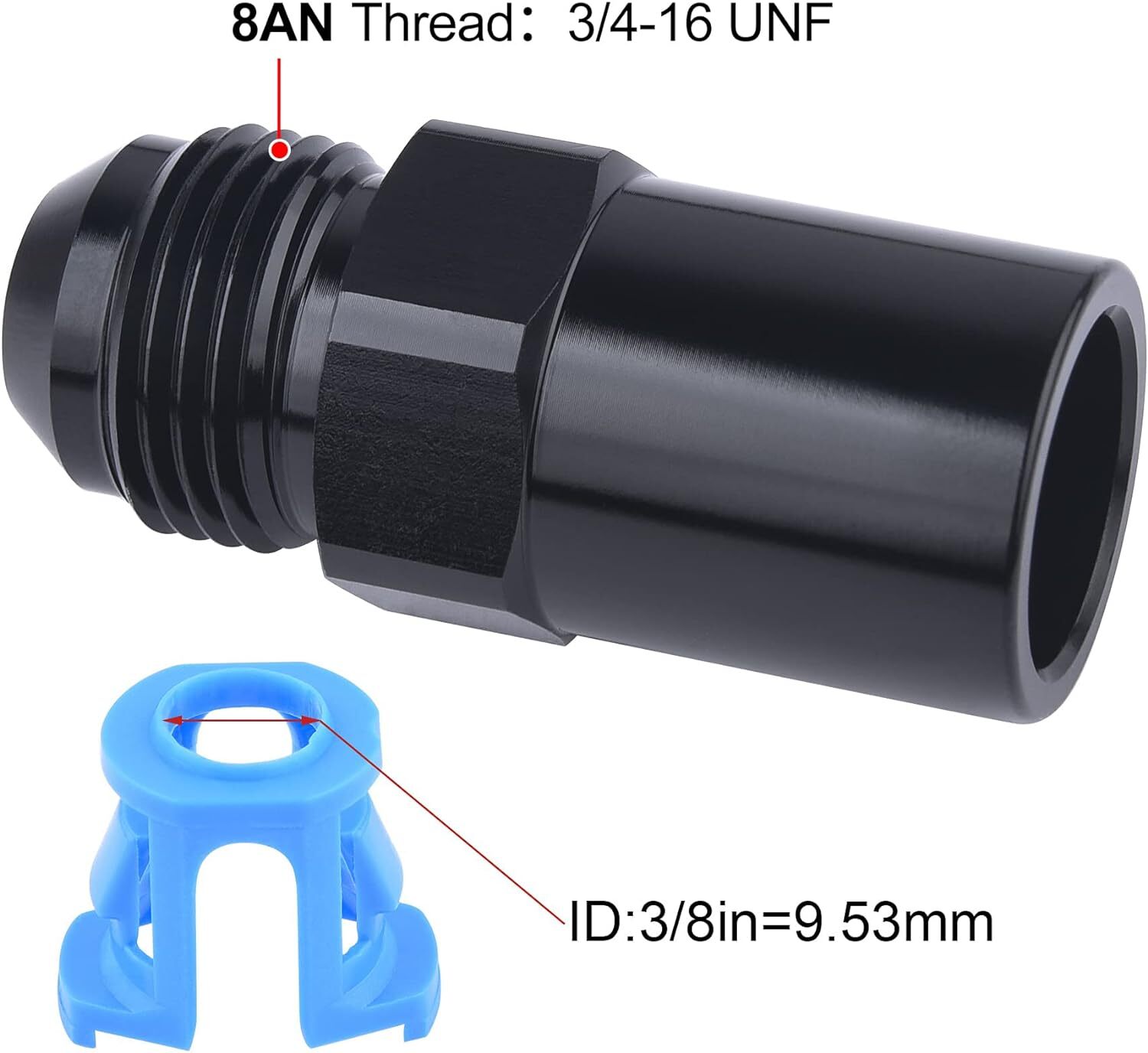 Product Features: Type: EFI Fuel Rail Fitting Adapters Color available:Black Fitting Type: Fuel Injection Material: Aluminum alloy Size:8AN Male Flare To 3/8"SAE Designs: Spring Lock Connection Type: Push-On Application: fits stock return lines and supply lines of EFI fuel filter and fuel rails Surface Finish: Anodized Package List: 2Pcs Fuel Rail EFI Fitting Adapter Electronic Fuel Injection (EFI) style fittings are being used on several of the fuel system components. Typically these are found a bit more often on returnless fuel systems and more specifically on the fuel rail, fuel feed (firewall) hardline and we've also seen them used on some fuel pump hangers. These special adapter fittings are designed to quickly adapt a male.EFI connection to a male 6AN fitting. This makes converting EFI parts to a custom AN fuel system very simple. Product Description: Fuel rail fitting adapters are designed to fit your stock return lines and fuel rails. They are made of aluminum alloy and are available in black anodized finishes. The adapters use the factory spring lock design with an outlet in AN size specifically made for braided stainless steel hose. Product Features: Type: EFI Fuel Rail Fitting Adapters Color available:Black / Silver Fitting Type: Fuel Injection Material: Aluminum alloy Size:8AN Male Flare To 3/8"SAE Designs: Spring Lock Connection Type: Push-On Application: fits stock return lines and supply lines of EFI fuel filter and fuel rails Surface Finish: Anodized Package List: 2Pcs Fuel Rail EFI Fitting Adapter Note: 100% brand new, never used or installed, We sell DIY (Do It Yourself) Items with a few exceptions. No Installation Guides Are Included, We Highly Recommend To Seek Professional Installation Please check that the sizes match before purchase. If you have any questions, please send us a message. For any inquiries or special requests such as larger amount ordering please write to us.