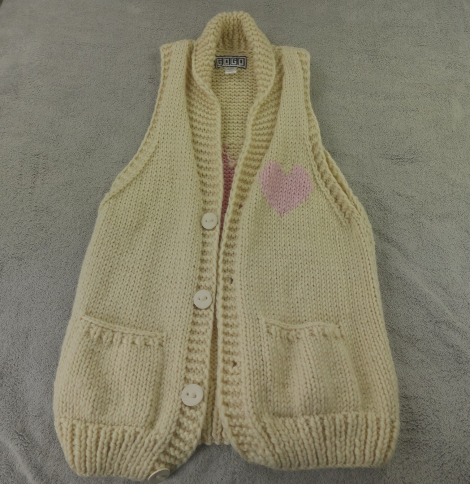 GOGO Sweater Womens One Size Cream Pink Wool Heart Swing Vest Handknit. Original MSRP of $563, sold out online. This is the longer length vest. Excellent pre-owned condition, no stains, tears, or signs of wear noted, please review all photos. See photos for measurements. If we missed something, don't worry, we offer free returns. Just indicate, "just didn't like it," for any reason, and we'll pay for the return. Thanks for visiting!