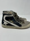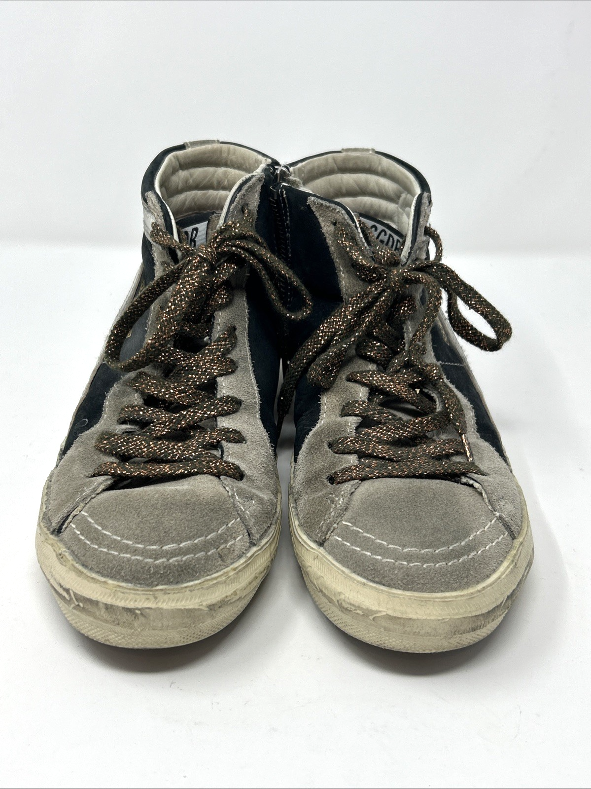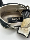 The Golden Goose GGDB Slide sneakers are a stylish and fashionable choice for women who want to make a statement. These multicolor sneakers feature a unique design with black, white, and grey suede, as well as gold laces that add a touch of luxury. The mid-top shoe shaft style and athletic type make them comfortable and versatile for everyday wear. With the iconic Golden Goose brand and star theme, these sneakers are sure to be a standout addition to any wardrobe. Made in Italy with high-quality materials, these sneakers are a perfect blend of fashion and functionality.