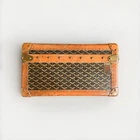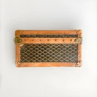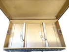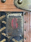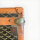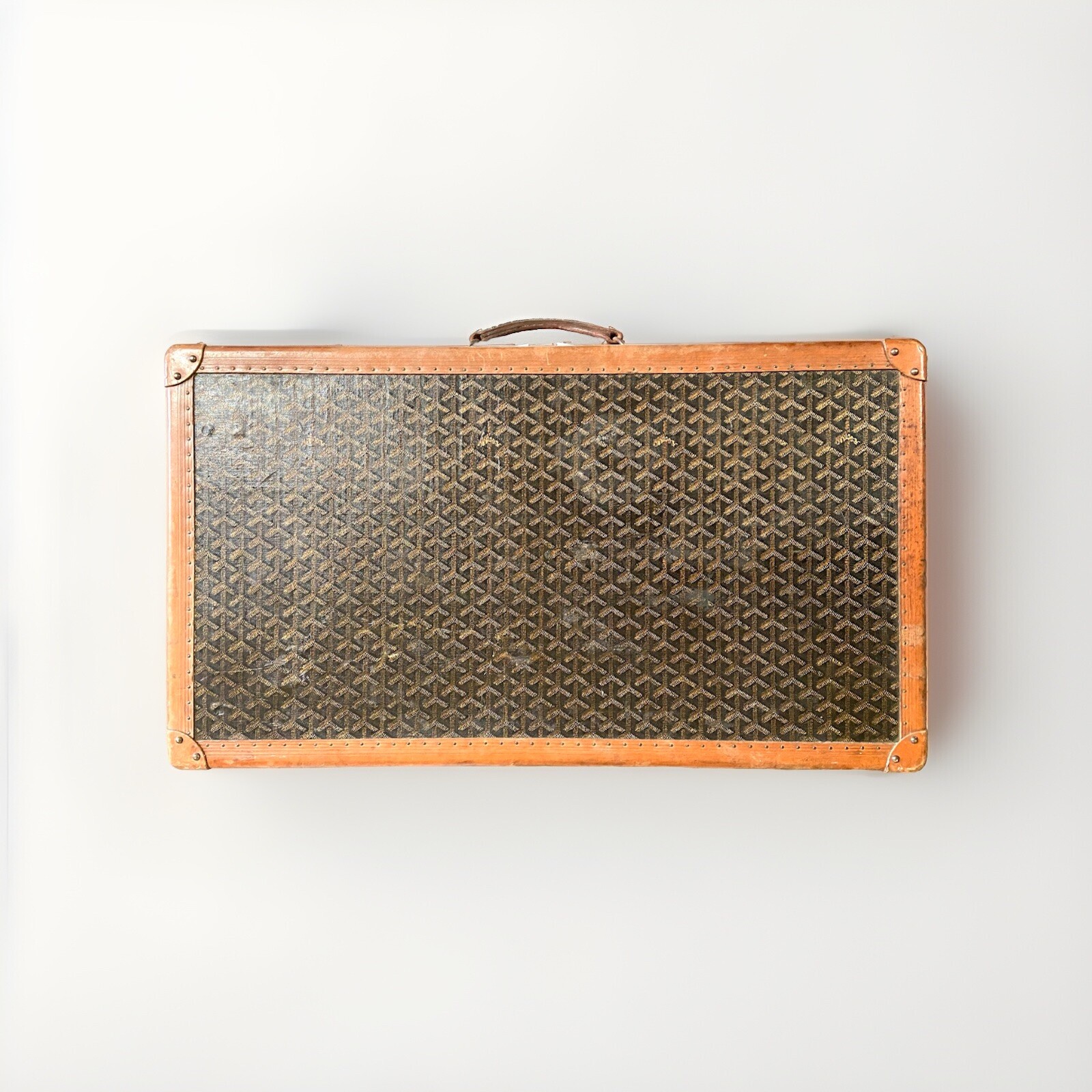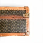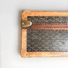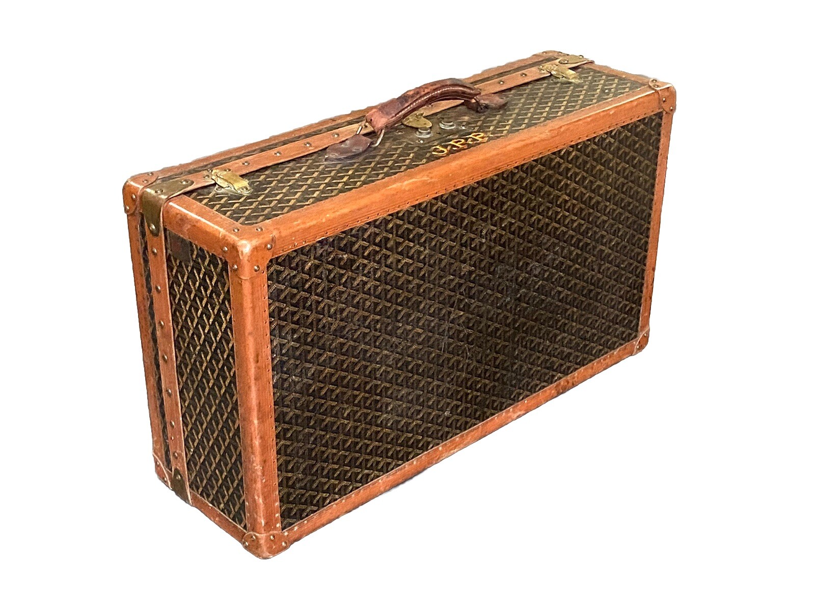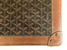 Coated canvas w/hand painted GOYARD signature chevron design. Solid brass lock, lock clasps, edge brackets, hinge and nailheads. Leather handle and exterior trim. Monogrammed. Keys (2) included. Original interior tray and brass clamps on logo canvas straps all in good condition. Dimensions: 27.75” x 15.75” x 8.75” Damage to leather trim at bottom of case and underside of leather handle. Exterior leather trim cracked at top of case near lock mechanism. Staining and damage to interior fabric lining. Please see all pics for details of condition.