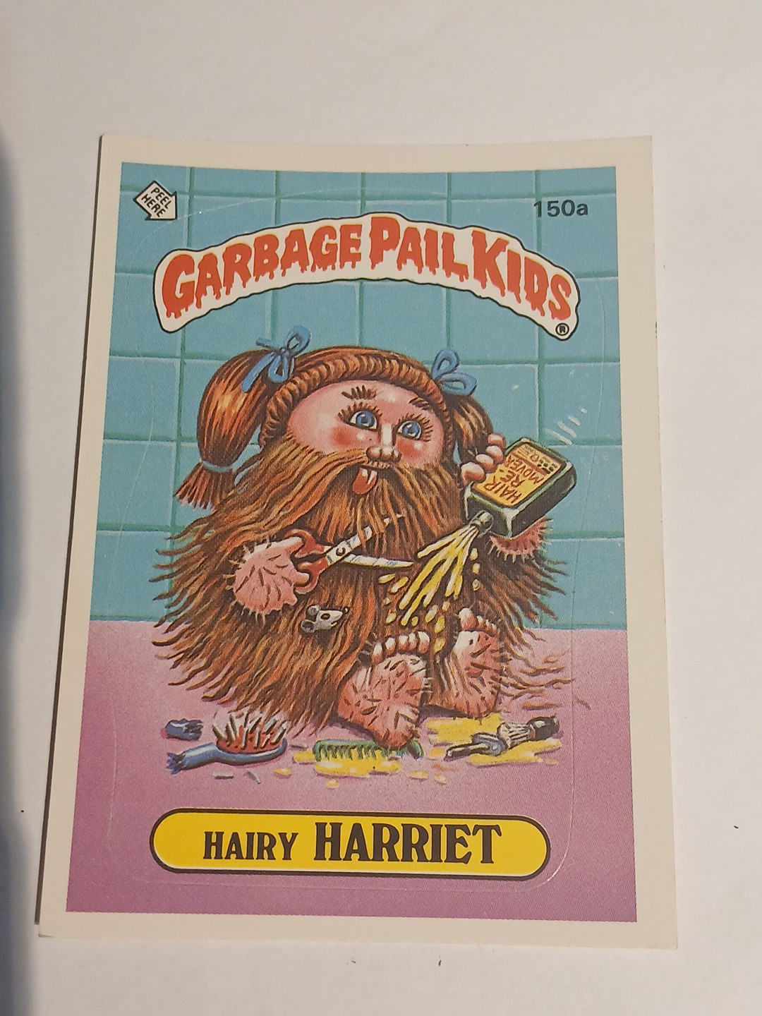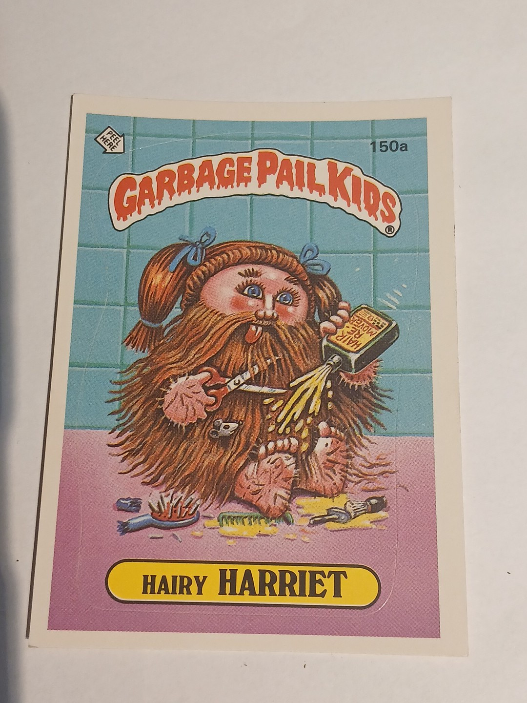 This is a vintage Garbage Pail Kids card from Series 4, featuring the character Hairy HARRIET. It was manufactured by Topps in 1986 and is a non-sport trading card. The card is also a sticker and has the number 150a. It belongs to the franchise Garbage Pail Kids and is a collectible item for fans of the series.