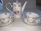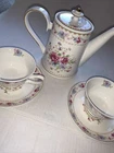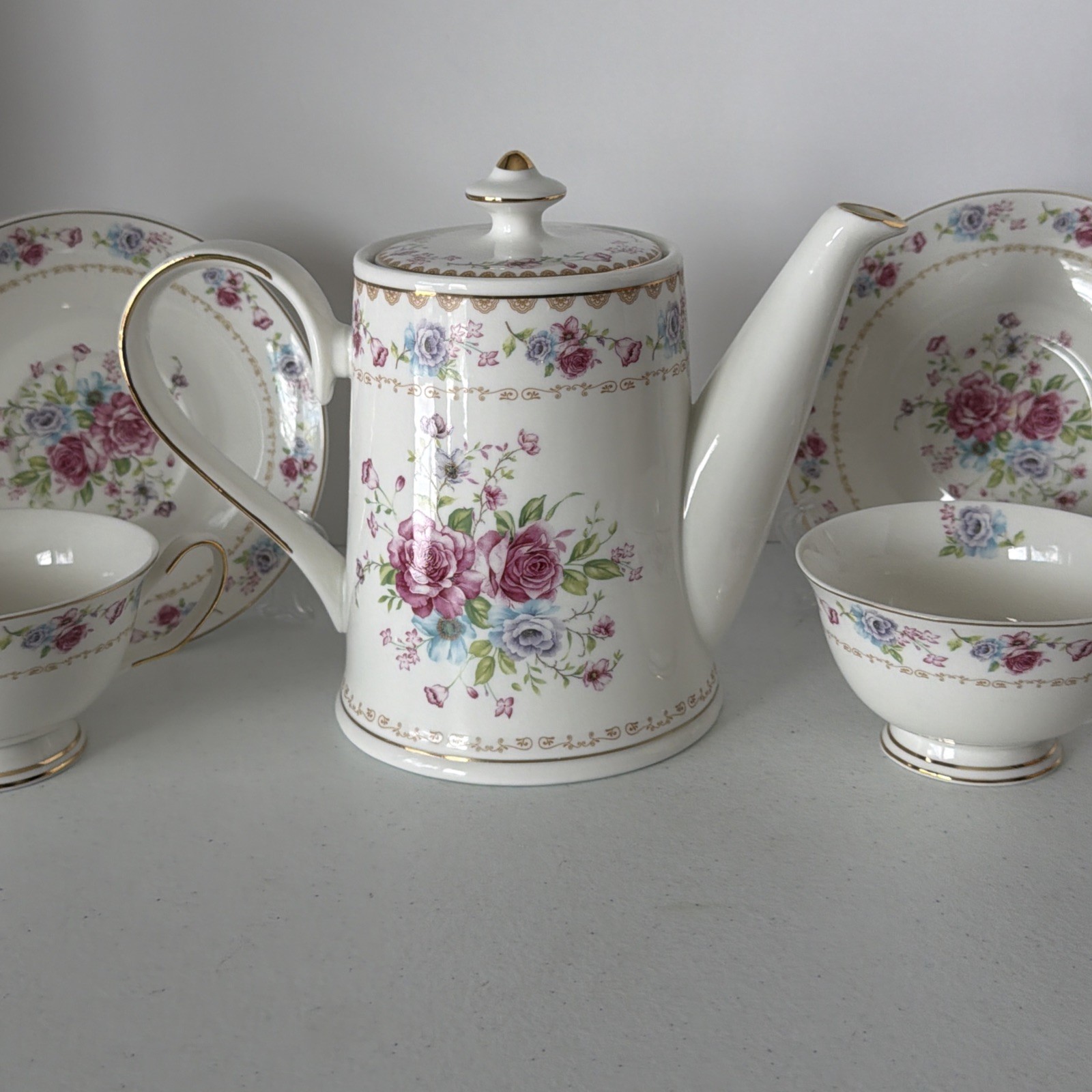 GRACE'S TEAWARE PINK ROSES 2 CUPS WITH SAUCES & TEAPOT FLORAL. One cup has a chip. Other pieces are beautiful vintage condition with no chips or cracks.