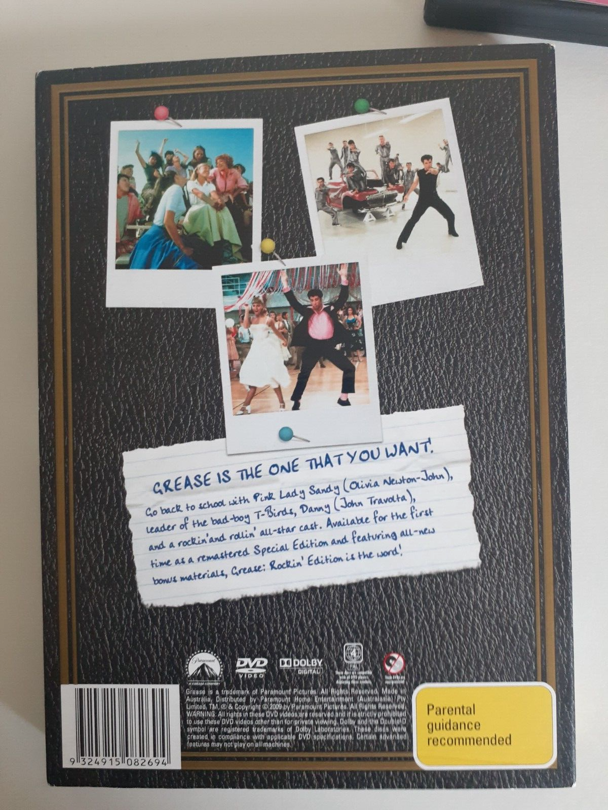 This listing is for the following DVD - it is Grease! This is the 2 disc Rockin' Edition. It also features a very cool slipcase, made to look like the 1959 Rydell High School Yearbook! This is a Region 4 dvd for Australian and Multiregion dvd players. This dvd is in good preloved condition, other than a small flaw on the top of the slipcase, as shown in the photos. Please view the photos carefully as they show the condition in full. PLEASE NOTE: within Australia, your dvd will be sent in a padded bag as letter post to keep postage costs down. If you'd like it sent as a parcel with tracking, please select the second postage option! Powered by eBay Turbo Lister