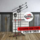 Selling on eBay since 1999 eBay Shop About Us View Feedback Save Us Contact Us Store Categories Geek Stands Shop Microphone Stands & Microphone Truss Stage & Speaker Stands Snare Drums Instrument, Microphone Cables Guitar Stands & Racks Rackmount Stands & Road Cases Keyboard Stands Drum Hardware & Stands Piano Benches & Seats Music Stands Why Shop With Us? We are the Authorized Brand Dealer - 1 Year Warranty Included! Item Description Telescoping Microphone Stands by Griffin (PACK OF 3) with Mic Stand Adapter This mic boom stand features three legs that retract and fold up to a neat package allowing for ultimate portability. A microphone clip is included with each tripod microphone boom stand. Since we are offering three (3) telescoping microphone stands, you will receive three (3) microphone clips as well. Stable, tough, and affordable, all of these telescoping microphones stands extend up and over in order to provide a microphone close to the performer with the straight bar distanced away making it ideal for performers. You may attach any standard sized microphone clip to the boom arm of these telescoping microphone stands with steel tubing construction. Rubber rest pads on the stands feet hold the boom microphone stand firmly in place. For a straight stand, remove the boom arm to reveal a straight microphone stand with an adjustable height from 27 inches to 62 inches, conforming to every musicians personal preference. Also includes, three mic XLR cable measures twenty (20) feet long and has an XLR male connector on one end and an XLR female connector on the other end. Every microphone XLR cable features a 12-strand copper conductor, and all of the XLR mic cables copper wiring is oxygen-free 24 AWG (American Wire Gauge). Unlike other cheaper mic XLR cables, this 24 Gauge wire signifies that every cable is considered professional grade. TRIPOD MIC STAND WITH MIC MOUNT - KEEP YOUR MIC SAFE Read More Pro-grade stands for microphones offer top quality designed for stage performances, seminar presentations, church sermons, and more. The adjustable microphone stand tripod base is sturdier than a round base and harder to tip over. The lighter weight of the tripod base will help keep your wires from the damage caused by a heavy mic stand accidentally placed on top of the wire. Each studio mic stand will also have slip-resistant rubber feet. TELESCOPIC MICROPHONE BOOM ARM, REMOVABLE MIC BOOM ARM Read More A perfect microphone stand for singing! Thanks to the microphone arm stands efficient design with 2 interlocking steel pipes, the telescopic boom arm allows you to reach further and provides more flexibility. It can also be removed and converted into a straight microphone stand. Max microphone holder height with boom: 88". Shaft length: 34" to 57". Mic stand boom arm length: 27" to 43". Leg spread width: 20.5". MIC ARM STAND WITH STURDY STEEL SHAFT DESIGNED TO LAST Read More Well-built with extremely durable, steel tubing construction, these telescoping tripod microphone boom stands are made to withstand constant abuse when in use and last for years to come. Stable, tough, and with a nice black finish that gives them a beautiful, sleek appearance, these are some of the most affordable solutions for every professional or amateur performer. RECORDING MICROPHONE STAND WITH PROFESSIONAL 20FT XLR CABLE (BY FAT TOAD) (PACK OF 3) Read More Featuring super low signal resistance, each of these 20ft long mic cables offers superior clarity and freedom from outside noise interference promising an exceptional, impeccable sound, every time. The 12 strand copper conductor and 64 strands of braided copper coated aluminum shielding ensure superb noise protection and minimum electrostatic hum. Oxygen-free, with 24 AWG (American Wire Gauge) copper wiring. Telescoping Mic Boom Stands by Griffin Specifications Boom Mic Arm length: 27 inches to 42 inches Mic Tripod Shaft length: 34 inches to 62 inches Studio Microphone Stand Gross weight: 5 pounds each Maximum height with boom: 99 inches Microphone Tripod Leg spread width: 20.5 inches XLR Cable has Durable 3 pin XLR male to 3 pin XLR female connectors Each XLR cable is 20 feet long XLR Cable: 24 AWG (American Wire Gauge) Griffin Is a US Brand that is Owned & Proudly Operated in Tyler, TX USA Read More Griffin is a small owned brand in Tyler, Texas, USA. Since 2011, the Griffin brand has been specializing in the development, design, and quality improvement of its snare drums, drum accessories, DJ speaker and DJ light stands, music studio equipment stands, and other musical and stage performance accessories. Whether youre just starting in search of DJ equipment for beginners or a professional looking for music recording equipment, Griffin has a product for you. We put that belief into practice every day by offering dependable products made with high quality, durable materials that will last a lifetime. We Have Passion! Griffin is 100% operated by Musicians & DJs Read More We feel strongly that a brand that specializes in music gear accessories should also be fully staffed by people who have a passion and love for the product. Griffin is fully operated by musicians and DJs. We have a complete understanding of all our products from portable stage platforms, audio racks, to adjustable keyboard stands, because we commonly use our pro-audio gear. As such, we understand you, the fellow musician, and are always here to help. Additionally, as a proud, USA brand, Griffin only authorizes sellers which are completely based in the USA. Quality Powder Coating Process at Our Factories Read More Our factories focus on quality and durability of the powder coating process. Metal parts are individually prepped, sanded, hung, coated and re-coated again. We ensure accurate color matching and use the highest quality of paint materials to ensure long lasting durability with rust protection and prevention. This results in uniform high-quality smooth finishes without sags or drip marks. Add