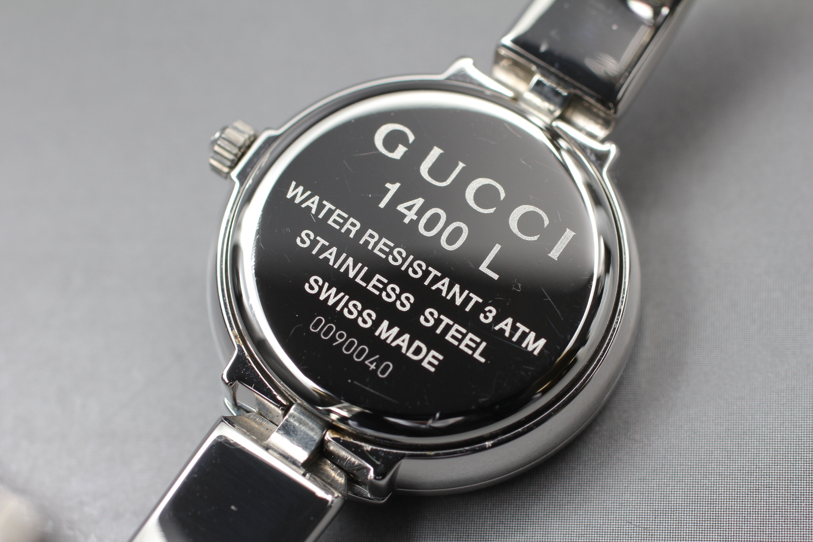 [N MINT / Full Set] GUCCI 1400L Black Silver Quartz Women's Watch w/ Box JAPAN #18 Description Total Condition; NEAR MINT TOP MINT Pre-owned, Almost new item MINT Pre-owned, Like new NEAR MINT Pre-owned, almost no signs of use EXCELLENT+++++ Pre-owned, minimal signs of use EXECELLENT Pre-owned, heavy signs of use VERY GOOD Poor appearance Serial Number; 009004 Appearance; Appearance is beautiful. tiny scuffs from normal use. It shows signs of use. *Please check photos. Functional; It works properly. The watch is currently running smoothly, but since it is a battery-powered watch, there is a possibility that it will stop during transportation. In that case, please replace the battery on your own. Please understand that we do not guarantee that this will happen. Please contact me first for return before you ship it back to me. The postage of the returned goods is a buyer burden. Bundled Items; Box,Instructions All you can see on the picture will be included in a set of a package. Above condition is based on my own opinion. Please check the photo carefully. Please feel free to contact me for any questions! Thank you. Shipping I send a product by FedEx International Priority . I attach the tracking number. Please bid it without worrying. Shipping is available from Monday to Friday. Weekends are not available because office is closed. Storage and Packing Storage Immediately after shooting, it is placed in a closed container with desiccant and stored for 24 hours and 365 days in a temperature and humidity controlled warehouse. All products, including cameras and lenses, are stored in a temperature- and humidity-controlled warehouse 24 hours a day, 365 days a year. Packing By weight and shape of each product, I use 13 kind of cushioning materials and pursue safety and weight reduction. Returns Unconditional Return Policy Customer service and satisfaction are very important to us. I have an unconditional return policy if notified within 30 days of the receipt of the item. All returned items must be the original condition. All return requests must be made within 30 days of the receipt of the item. Please contact me first for return before you ship it back to me. The postage of the returned goods is a seller burden. International Buyers Please Note: Import duties, taxes, and charges are not included in the item price or shipping cost. These charges are the buyer's responsibility. Please check with your country's customs office to determine what these additional costs will be prior to bidding or buying.