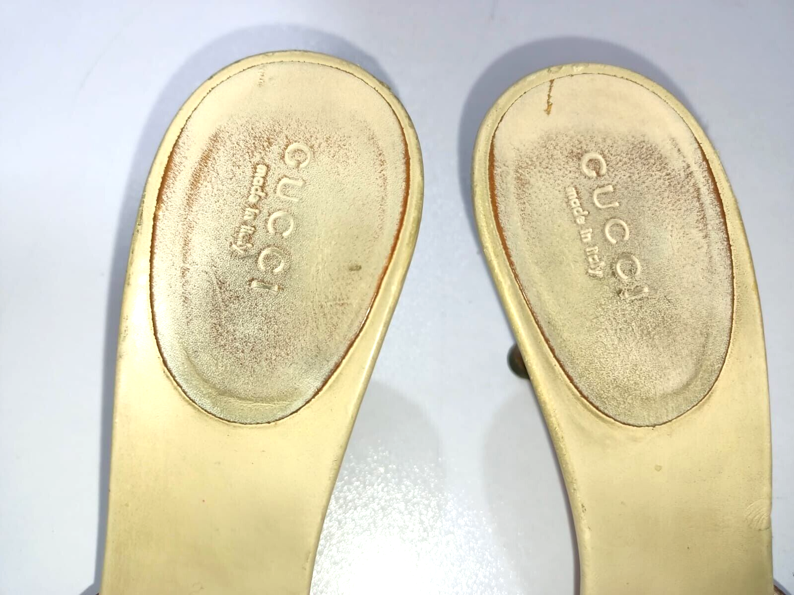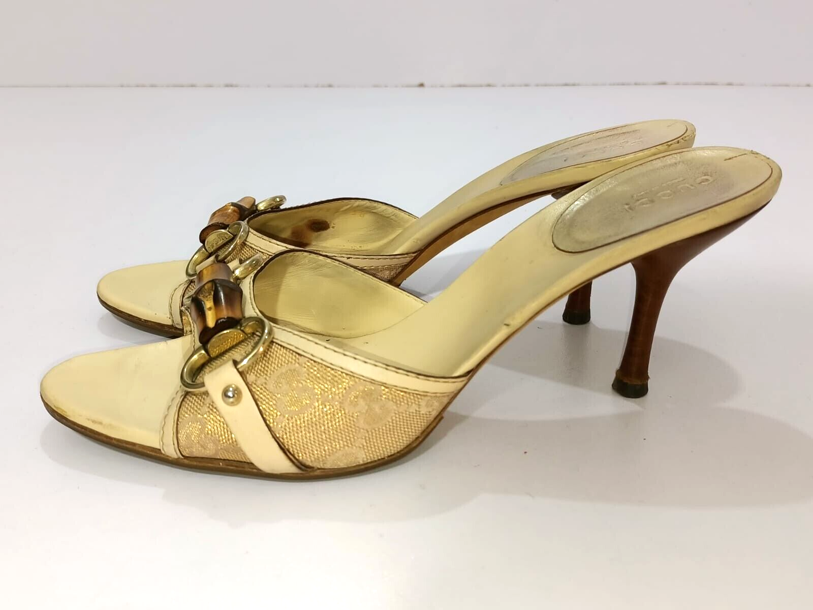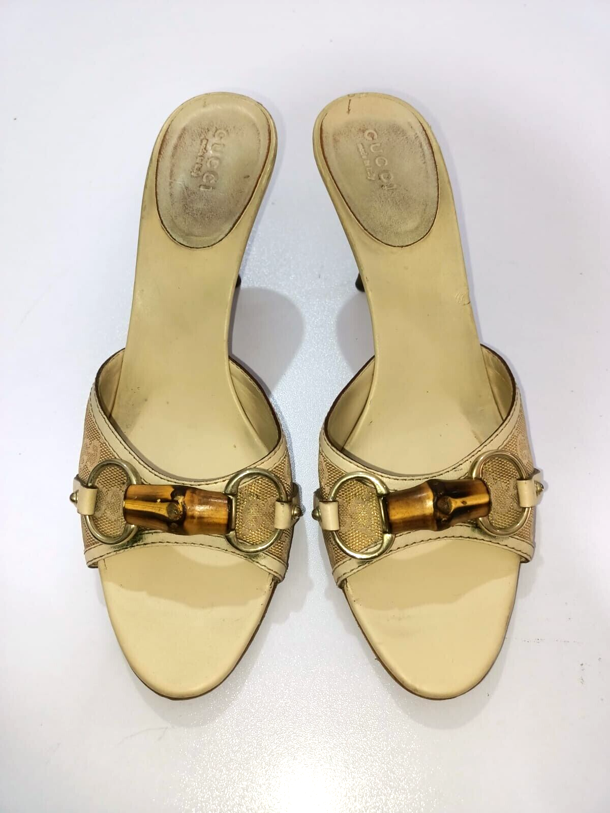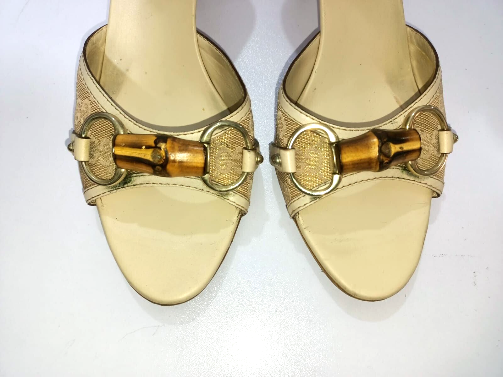 GUCCI BAMBOO HORSEBIT GG CANVAS SLIDES MULES SIZE, EU38, US7.5, IS IN USED CONDITION, > INNER SIDE VISIBLE STAIN AND DUTY, SIGN OF USE, > DOWN THE SOLE USED MARKS AND A RUBBER GRIP IS AFFIXED, > TOP OF THE HEELS ARE DUSTY AND LITTLE RUBBED SHOWING IN PICTURE NUMBER 6 & 11, > BOTTOM SIDE THE ONE HEEL IS LITTLE RUBB SHOWING IN PICTURE NUMBER 17, > OVERALL CONDITION IS IN USED, > REQUESTED TO SEE ALL PICTURES VERY CAREFULLY BEFORE THE BUYING CLEARLY CONDITION IS SHOWING IN ALL PICTURES, > IF HAVE ANY QUESTION RELATED ITEM THEN DIRECTLY MESSAGE ME IN INBOX, > RETURN IS NOT ACCEPTED, > DUST BAG AND BOX ARE NOT AVAILABLE, > SHIPPED WITH DHL INTERNATIONAL EXPRESS FASTER SERVICE
