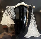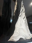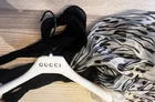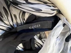 This Gucci Black & White Belt Print Scarf Wrap is a luxurious accessory made of silk, with a pattern featuring a belt print design. The scarf has a multi shape and can be worn in various ways, as seen in the photos. It is a stylish and versatile piece that can add a touch of designer flair to any outfit. Made in Italy, this high-quality scarf is 47 inches long and 18.5 inches at the widest point, making it a versatile and fashionable addition to any wardrobe. Comes with Gucci hanger.