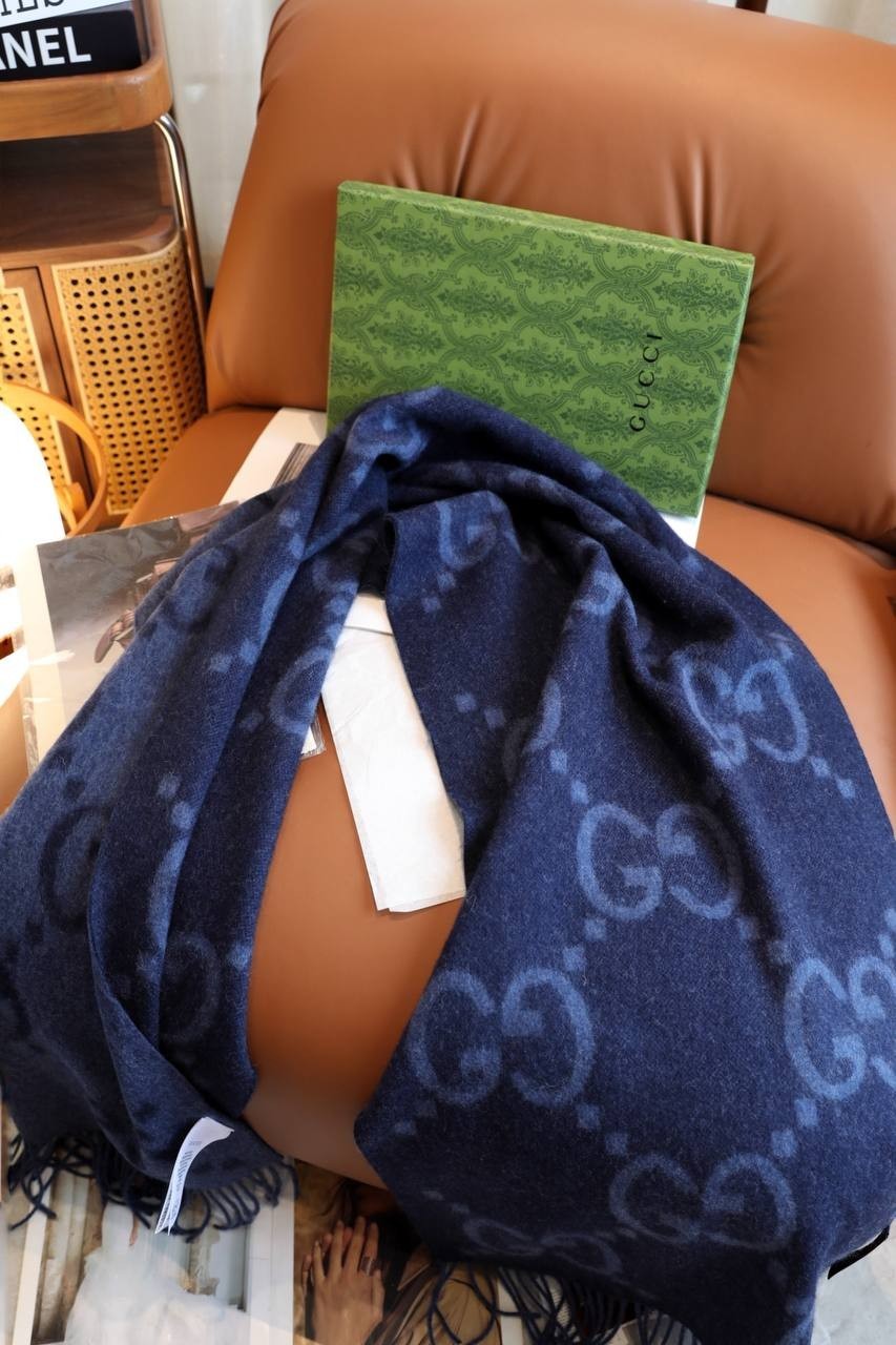 The product is a stylish Gucci GG Logo Jacquard Cashmere Scarf in blue and grey, designed for men. This elegant scarf features the signature Gucci logo pattern and is made of luxurious cashmere, making it a perfect accessory for winter and fall. The high-quality material and craftsmanship ensure both warmth and sophistication, making it a versatile piece that can be worn in various ways to elevate any outfit.