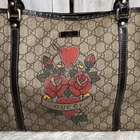 This Gucci tote is a stylish vintage find with the iconic GG print and floral tattoo heart design. Despite minor wear like scratches and a faint tobacco scent, it’s in solid condition for pre-loved luxury. Roomy enough for daily essentials (25x34x15cm), and the rich brown hue adds timeless charm. Perfect for fans of unique secondhand treasures—just note potential import fees. A great way to own Gucci at a fraction of retail!