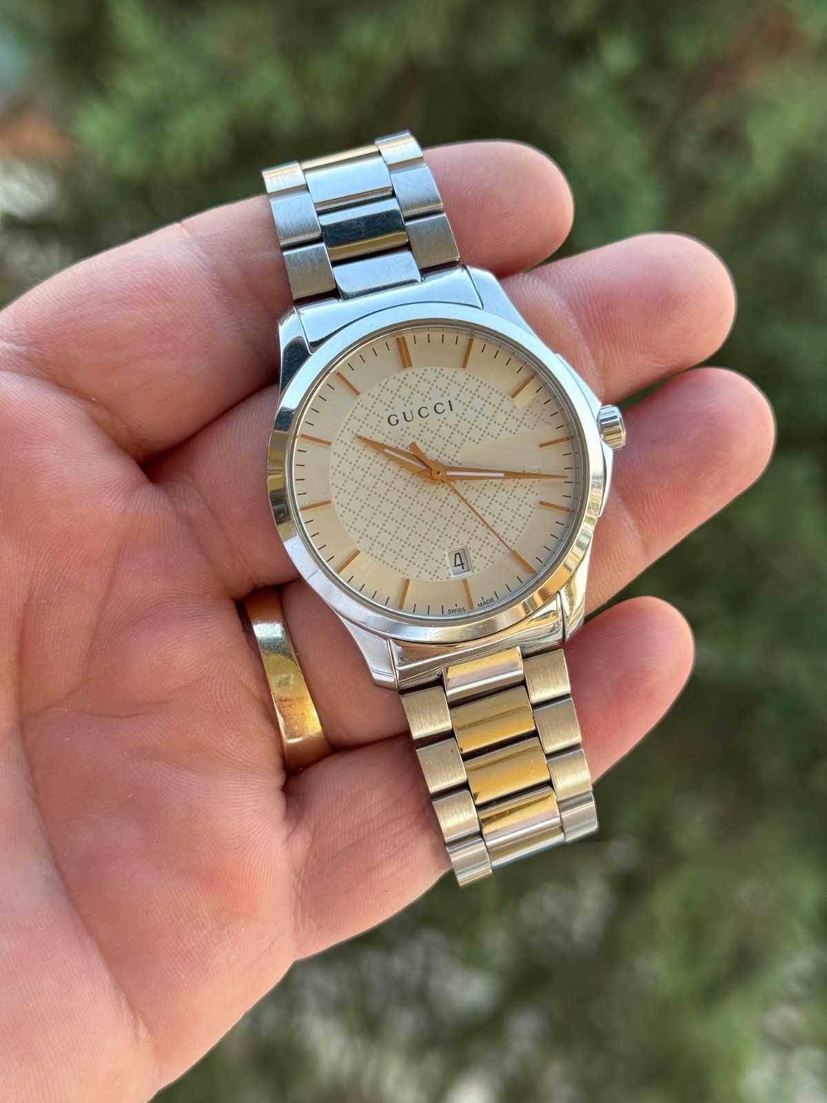 The GUCCI G-Timeless 38mm Mens Watch 126.4 is a luxurious timepiece featuring a silver and gold bezel, with a buckle closure and bracelet band made of stainless steel and leather. This vintage watch from the 2010s boasts a classic and elegant design with a black dial displaying logo, arrow markers, stick indexes, and baton indexes. With a Swiss-made quartz movement and water resistance up to 50 meters, this watch is perfect for both casual and formal occasions. The 38mm case size, 7 jewels, and left-handed design add to its unique and stylish appeal, making it a coveted accessory for those who appreciate luxury and celebrity-themed pieces.