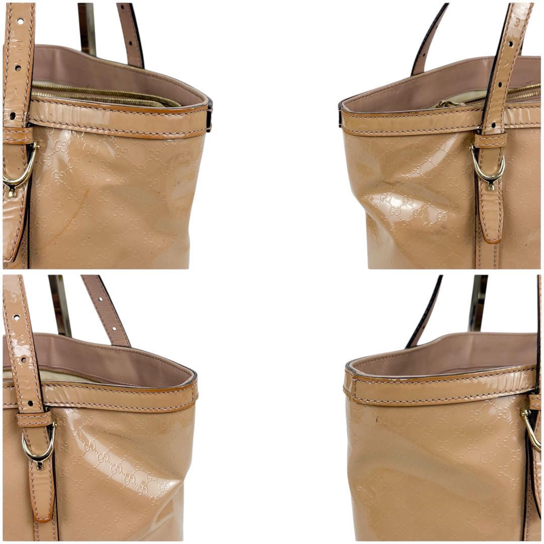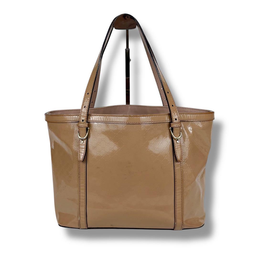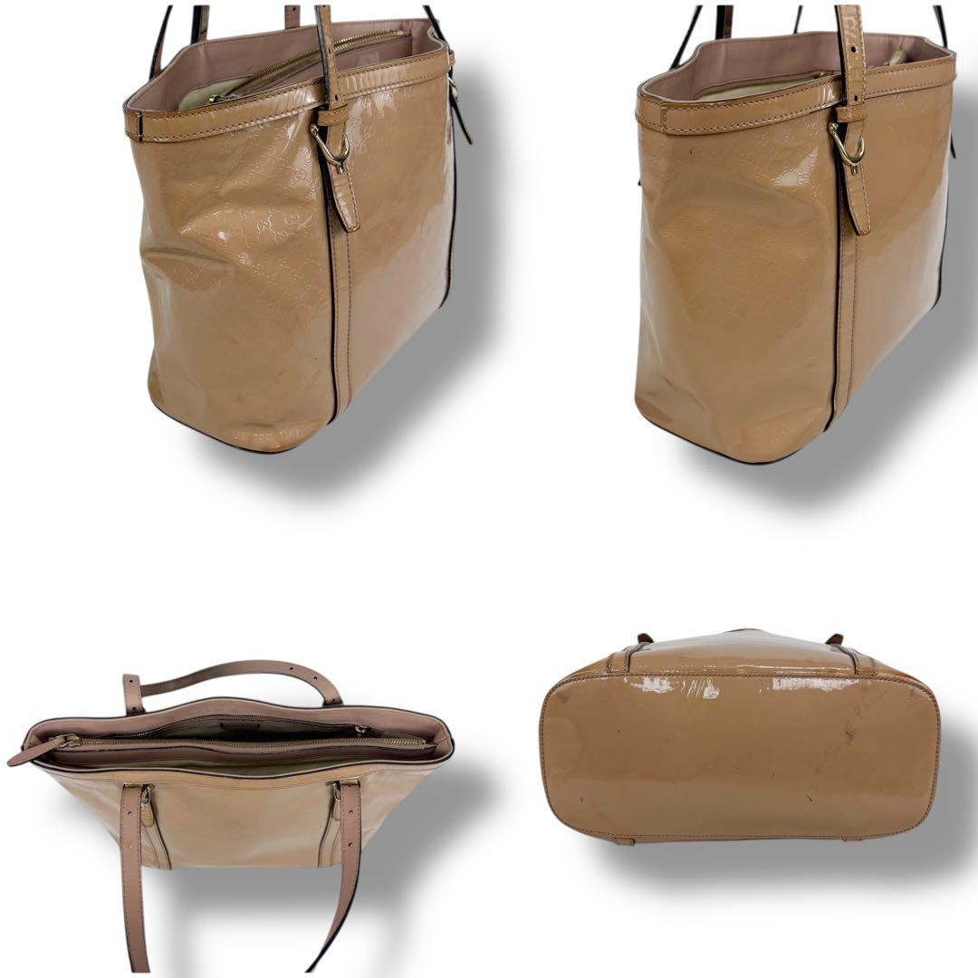 This GUCCI Micro GG tote is a stylish and practical choice—love the beige enamel/patent leather and the spacious interior with multiple pockets. While it shows some wear like scratches and corner scuffs, the authentic serial number and classic design make it worth it. Ships fast from Japan, perfect for everyday chic!