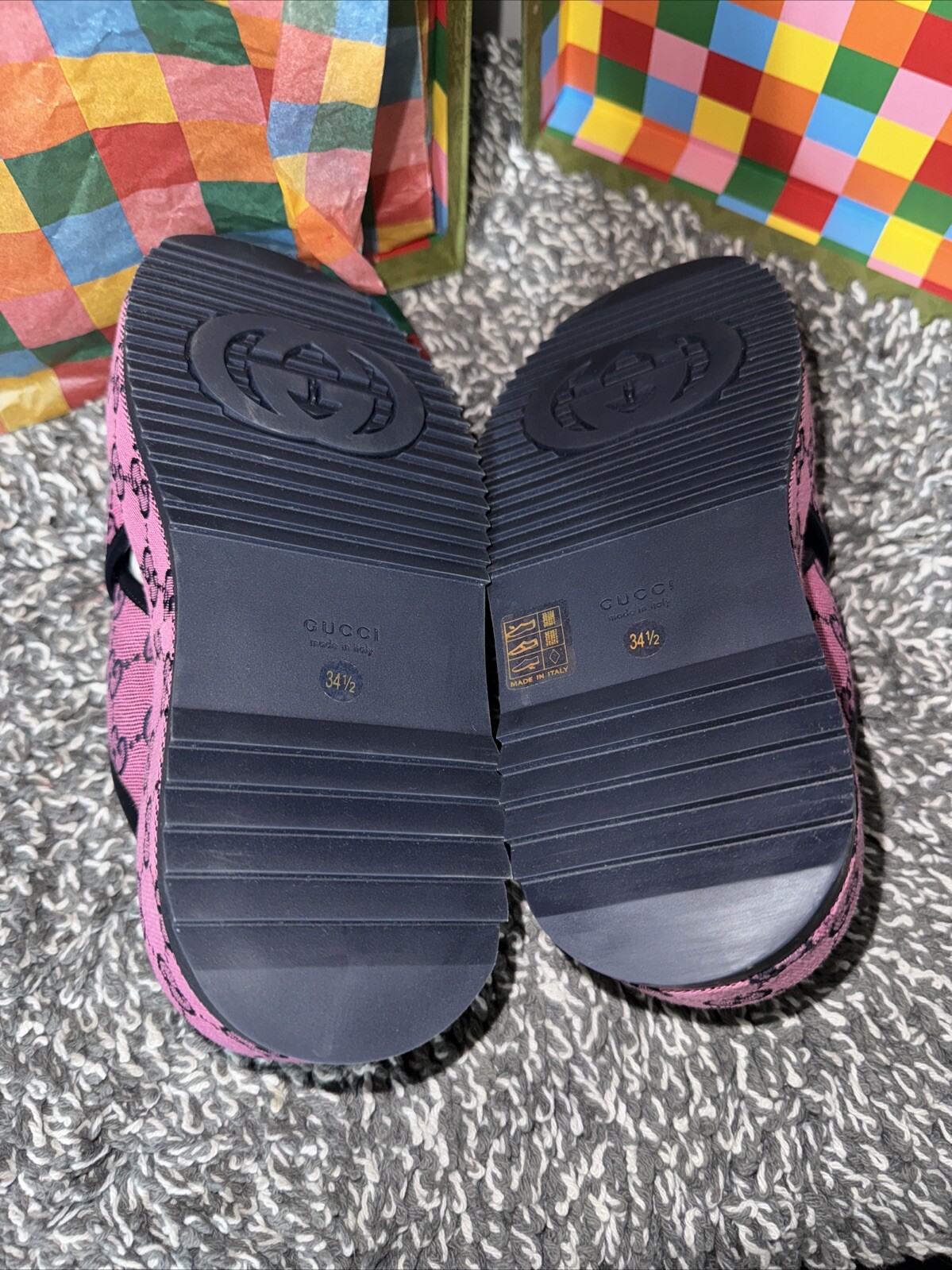 Elevate your style with these stunning GUCCI Monogram Multicolor Criss Cross Platform Slide Sandals. These sandals are perfect for women who want to make a fashion statement. The canvas upper material provides durability and comfort, while the multicolor design adds a pop of color to any outfit. The slide style makes them easy to slip on and off, making them perfect for everyday wear. The cross theme adds an edgy touch to the design. These sandals are available in US Shoe Size 37 and EU Shoe Size 37. Don't miss out on the opportunity to add these stylish sandals to your collection.