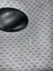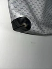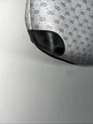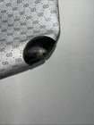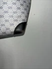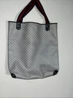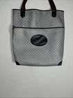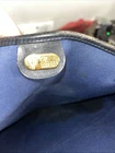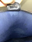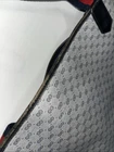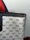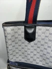 This is a vintage GUCCI Monogram shoulder bag in navy blue with a red and blue stripe design. It features gold hardware, a medium size, canvas and leather exterior material, and a red canvas lining. The bag has a monogram pattern, red handle/strap, and is designed for unisex adults. Made in Italy, this tote purse exudes a classic and timeless style. Pictures indicate wear