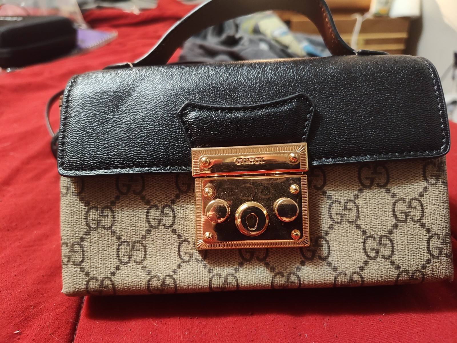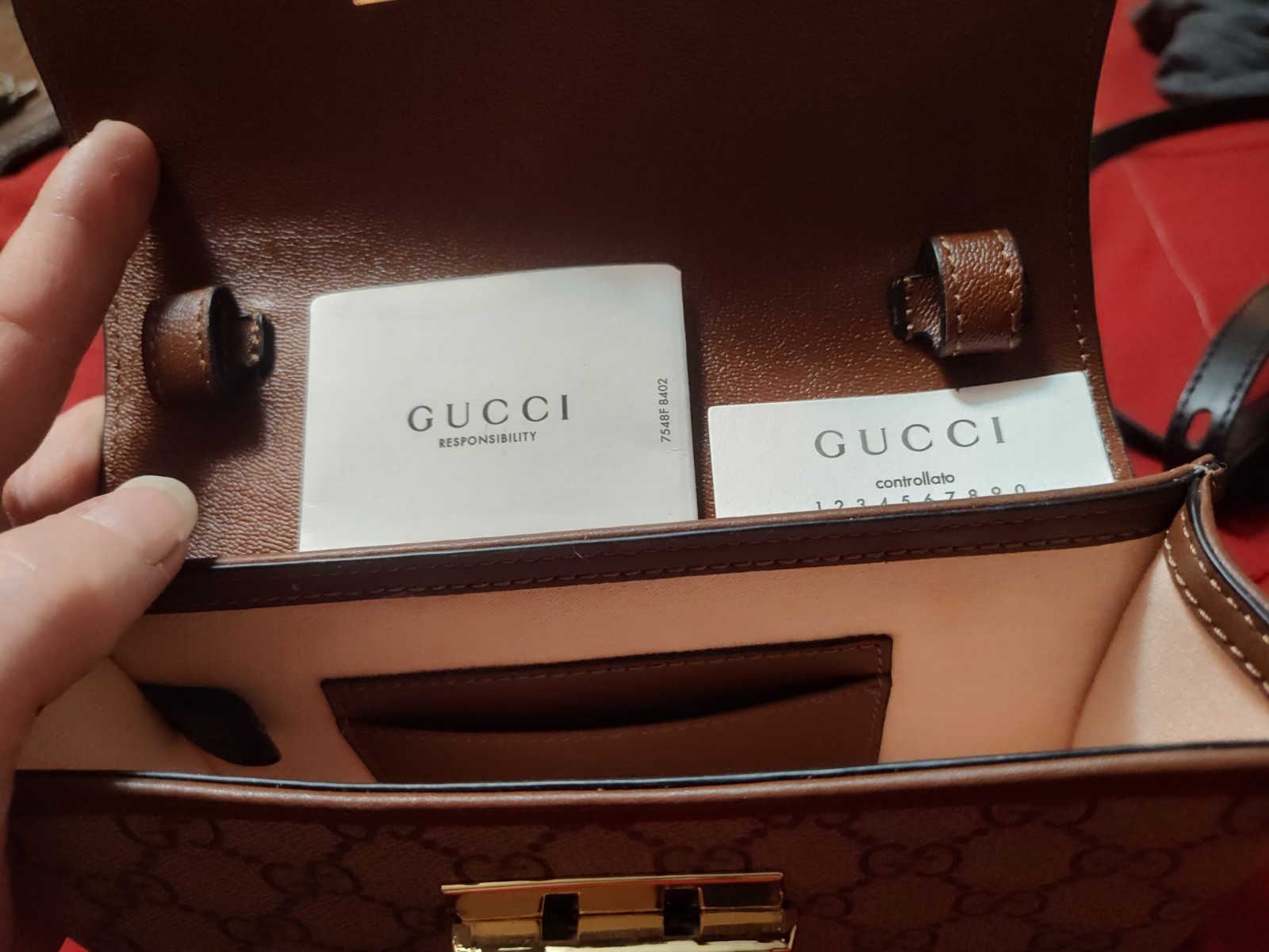 Elevate your style with this stunning Gucci Padlock Mini Top Handle Bag. Crafted from GG Supreme Canvas and Microfiber Viscose, this bag features a beautiful brown and black exterior color with a padlock closure. The top handle is made of brown leather and has a drop of 2". This mini bag is perfect for any occasion, be it a party, cocktail or business. It is lined with microfiber and has inner pockets for added convenience. The bag width is 8 inches, the bag height is 5 inches, and the bag depth is 3.5 inches. The hardware is gold colored metal and the bag is coated for added protection. This bag is from the Gucci Padlock product line and is made in Italy.