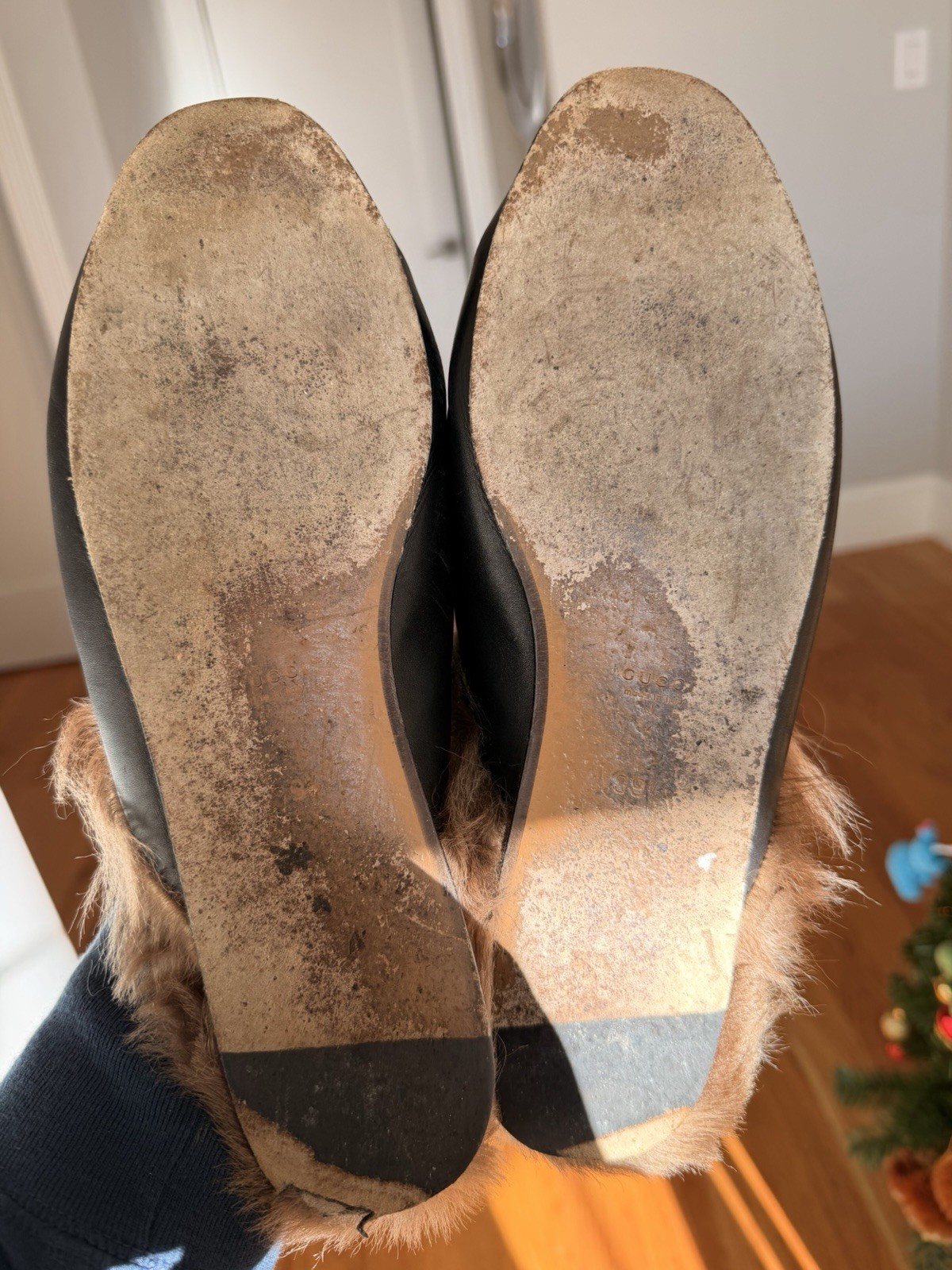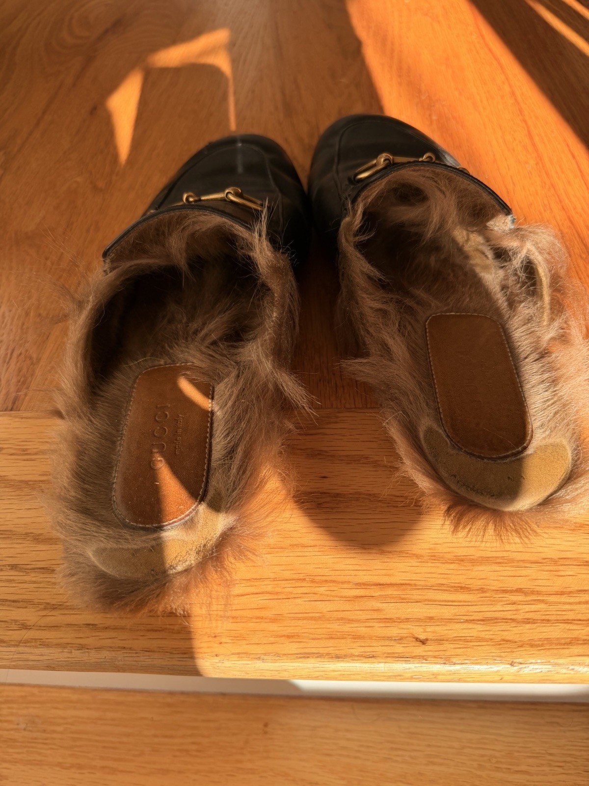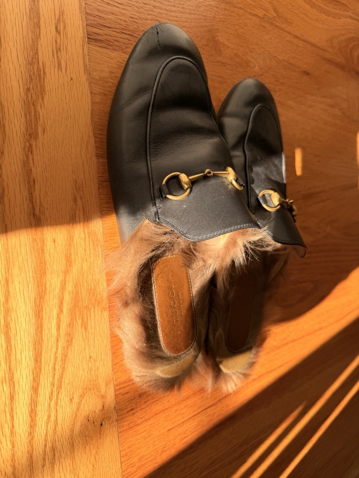 The product is a pair of Gucci Princetown horsebit mules in size 9.5 US and 39.5 EU. These shearling-lined leather slippers are designed for women and feature a classic black color with a flat style. The Gucci Princetown model is known for its elegant and stylish design, making it a desirable choice for luxury footwear. Used but plenty of life left in these!