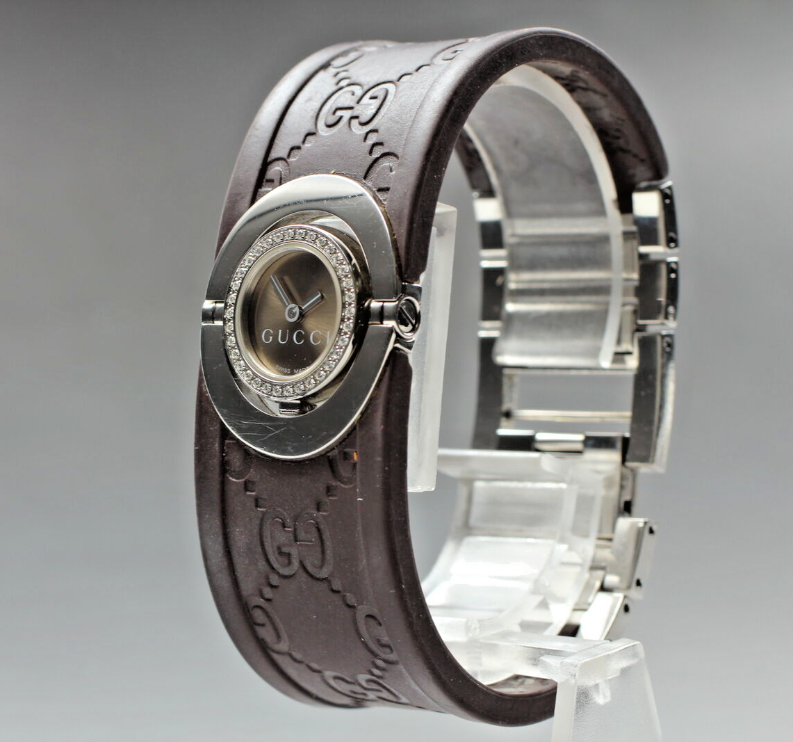 GUCCI Twirl 112 Diamond Bezel Brown Dial 16mm Ladies Quartz Bangle Watch #1000048301673 Description ⚠️ **IMPORTANT NOTICE FOR INTERNATIONAL BUYERS (especially EU countries including Germany):** Import duties and VAT are **not included** in the item price. These taxes **must be paid by the buyer upon delivery**. If you refuse the package due to unpaid customs, we will **deduct all shipping costs and handling fees** from your refund. Total Condition; The watch is in working condition · Bezel: Diamond-set bezel, shiny with light signs of wear · Case: Stainless steel, minor hairline scratches (see photo) · Dial: Brown sunburst dial in good condition · Crystal: No visible scratches · Bracelet: Stainless steel bangle with Gucci engraving. Fits up to approx. 16cm (6.3 inches) *Please check photos. Functional; It works properly. Bundled Items; All you can see on the picture will be included in a set of a package. Above condition is based on my own opinion. Please check the photo carefully. Please feel free to contact me for any questions! Thank you. Shipping I send a product by DHL,EMS. I attach the tracking number. Please bid it without worrying. Shipping is available from Monday to Friday. Weekends are not available because office is closed. Returns Unconditional Return Policy Customer service and satisfaction are very important to us. We have an unconditional return policy if notified within 30 days of the receipt of the item. All returned items must be the original condition. All return requests must be made within 30 days of the receipt of the item. Please contact us first for return before you ship it back to us. The postage of the returned goods is a seller burden. International Buyers Please Note: Import duties, taxes, and charges are not included in the item price or shipping cost. These charges are the buyer's responsibility. Please check with your country's customs office to determine what these additional costs will be prior to bidding or buying.
